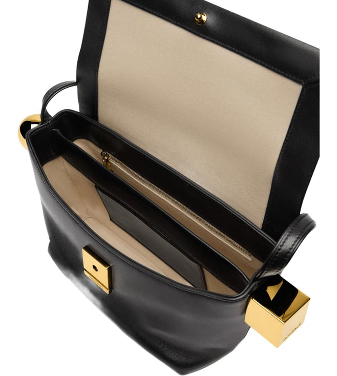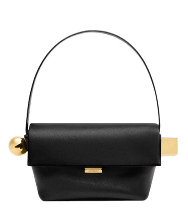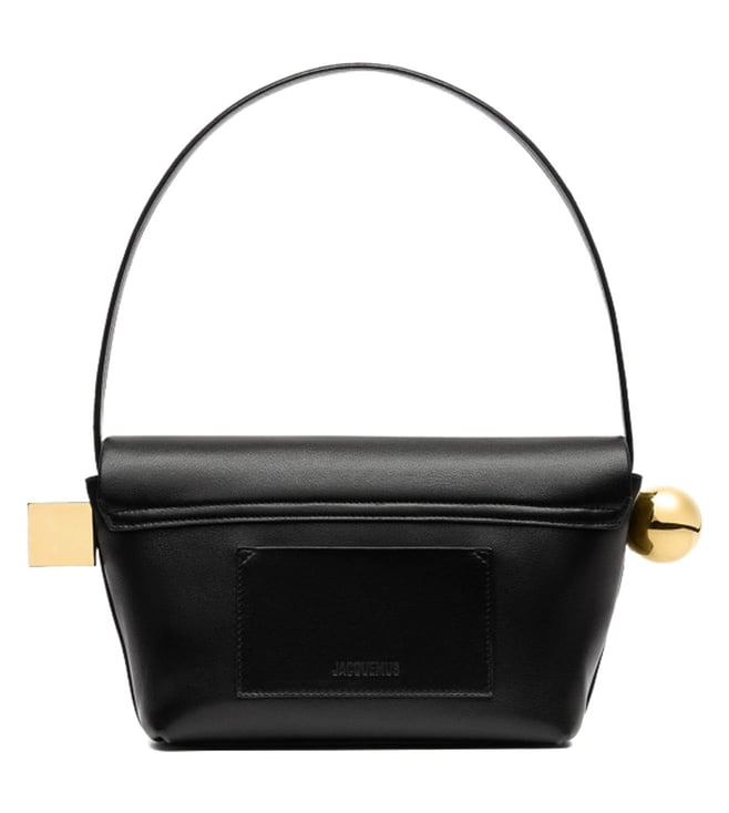 Expand the collection of your accessories in a trendy way with this bag from Jacquemus. Silver metal circle clasp ends and gold metal square large. Magnetic closure. Inside pocket for credit cards. Gold metal trim and logo. Color: black.
