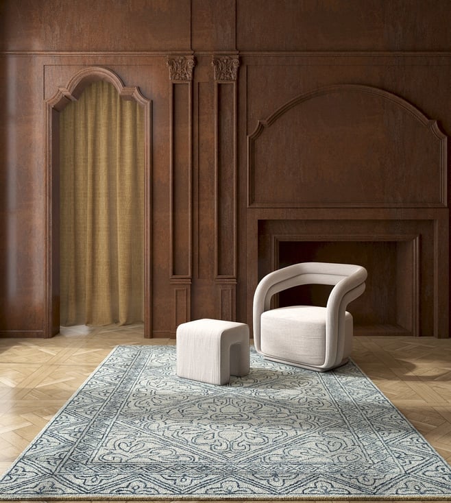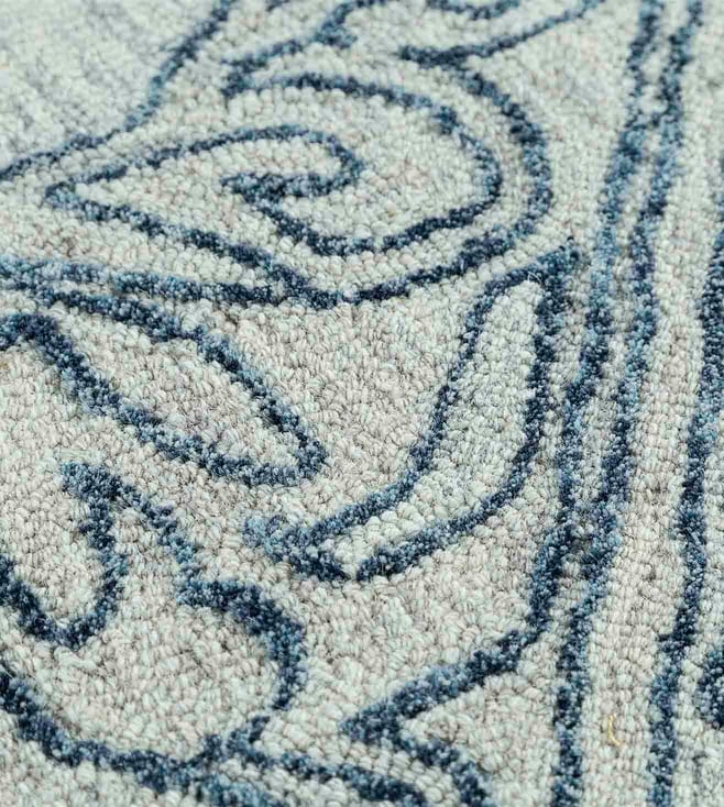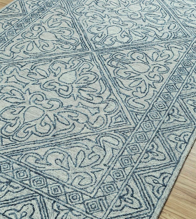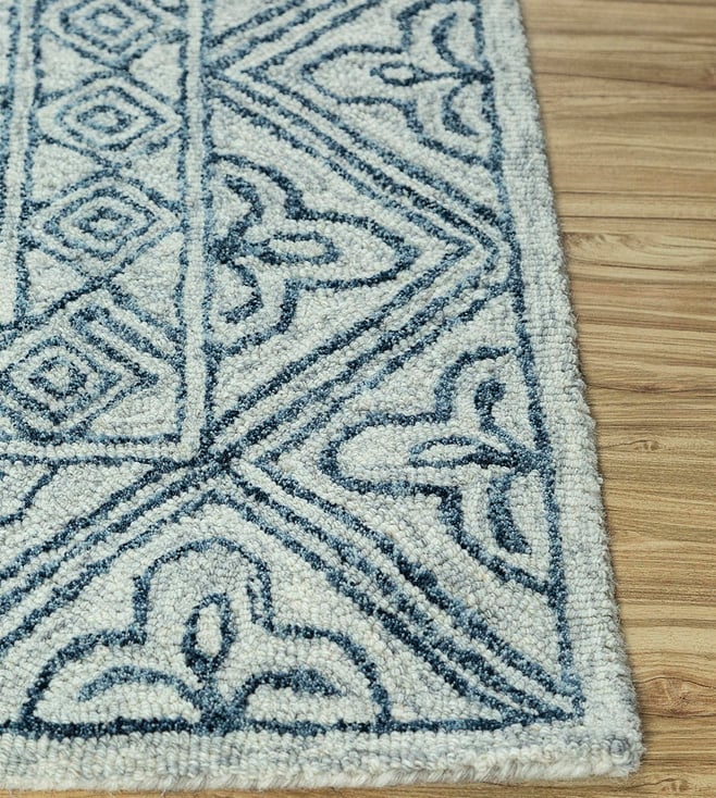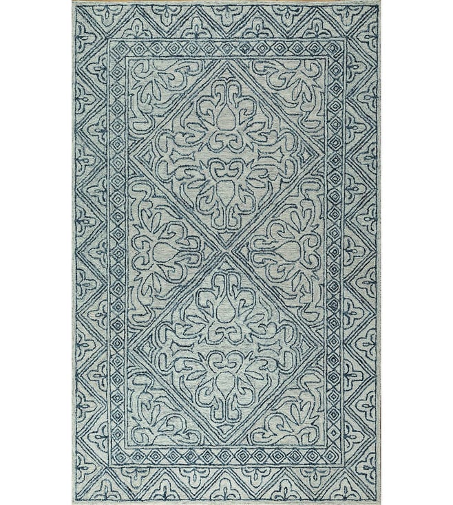Embrace the timeless elegance of Jaipur Rugs' hand-woven blue wool rug, a masterpiece for your living room or bedroom. This 5x8 ft rectangle, crafted with meticulous detail, boasts a captivating blend of textures and hues. Its rich blue tones, reminiscent of a serene sky, infuse your space with tranquility. The intricate patterns, woven with precision, add a touch of sophistication, while the luxurious wool pile provides unparalleled comfort underfoot. Weighing 17.6 kgs, this rug is a testament to quality and durability, promising years of beauty and warmth.