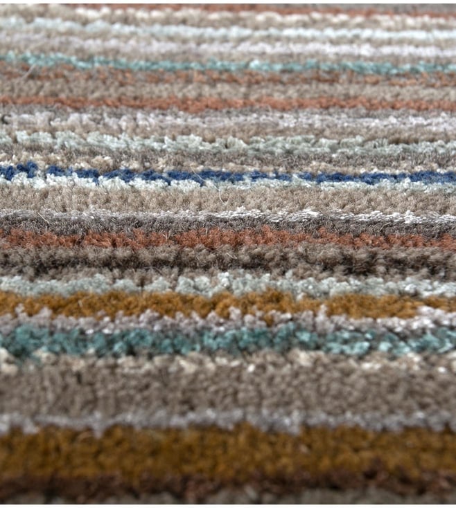 This carpet sets the mood or theme in your space. This elegant carpet is inspired by the play of light in nature. Tufted to perfection by hand, it is sure to tie together the decor of your space. It has been crafted with care using wool and viscose. Disclaimer: Product colour may slightly vary due to photographic lighting sources. Country of Origin - India.