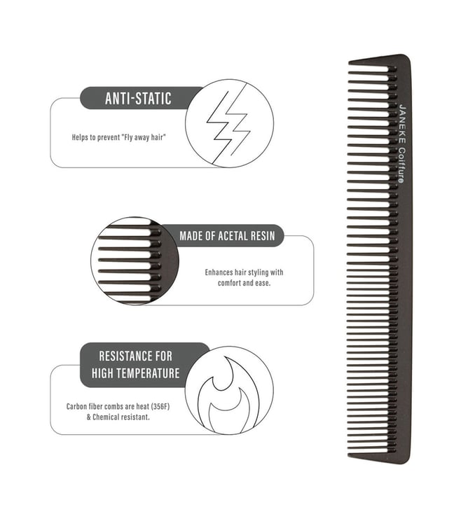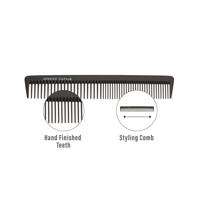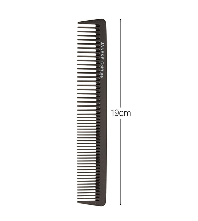 JANEKE 1830 Styling Comb in black color. 19 cm professional comb is heat-reasistant, unbreakable and durable. High-quality materials and hand finished teeth make this comb particularly indicated for a professional use. The item is produced of acetal resin, which makes the product extremely flexible and contributes to comfortable and simple usage for hair styling. This combo contains 6 x JANEKE 1830 Styling Professional Comb