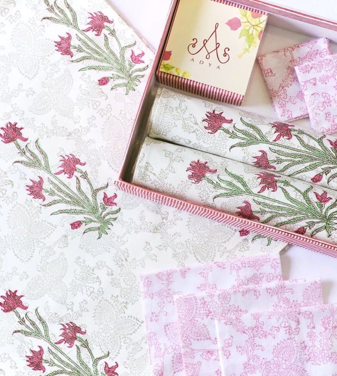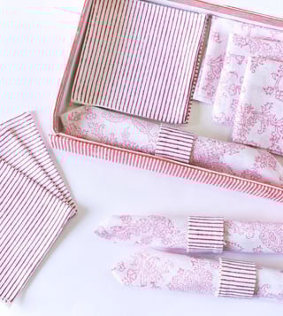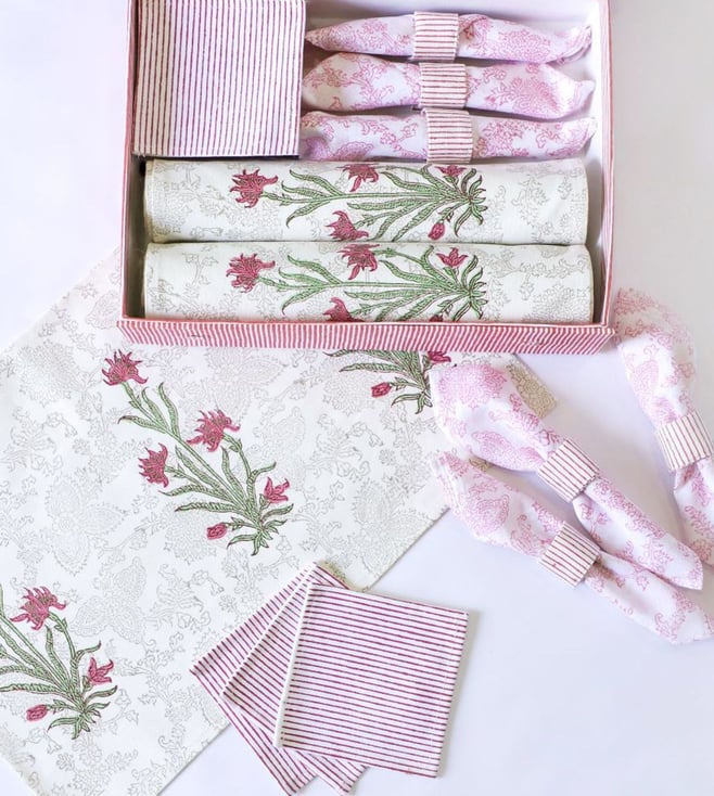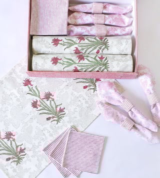 Indulge in the delight of a perfect dining experience with this carefully selected table mat set. Crafted from premium canvas cotton, these luxurious elements effortlessly complement your table, transforming every meal into a moment of tranquillity and sophistication. It includes a runner, 6 mats, 6 napkins, 6 coasters and 6 rings.