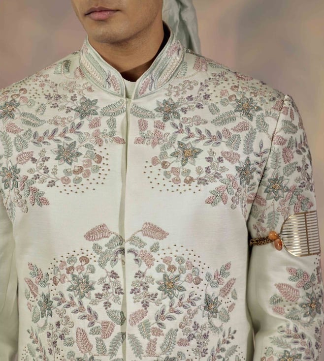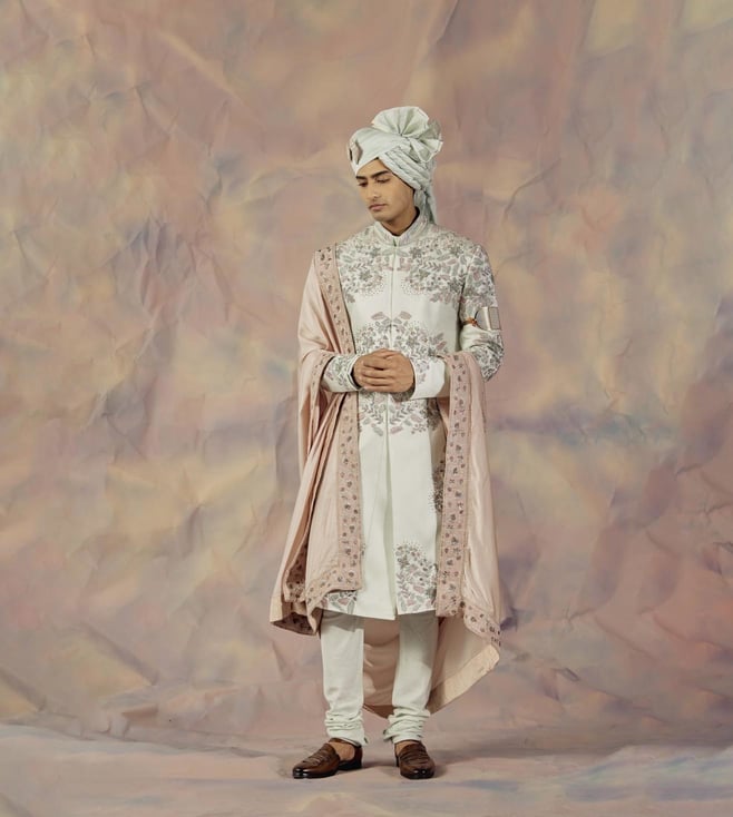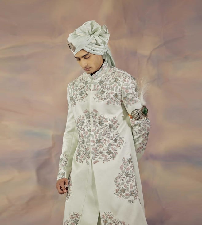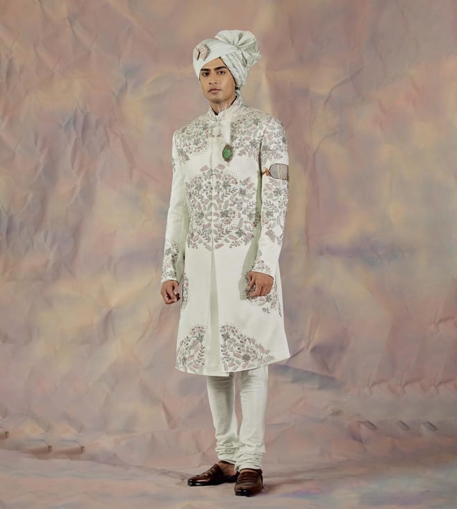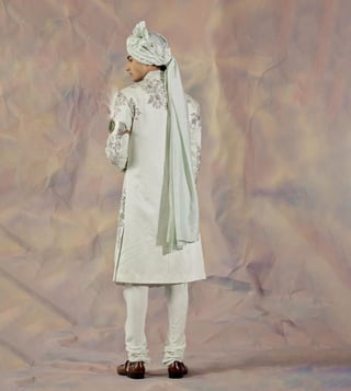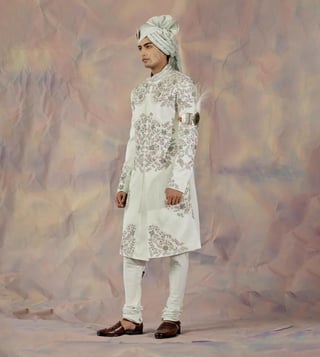 Rev up your fashion quotient by wearing this sherwani set. The placement of hand-embroidered sherwani has been adorned with embroidered details. An embroidered dupatta, matching safa, pintuck detailed kurta and churidar complete the set. Crafted with linen silk, this garment from the Pablo collection is soft against the skin and easy to maintain. Disclaimer: Product colour may slightly vary due to photographic lighting sources. Country of Origin - India.