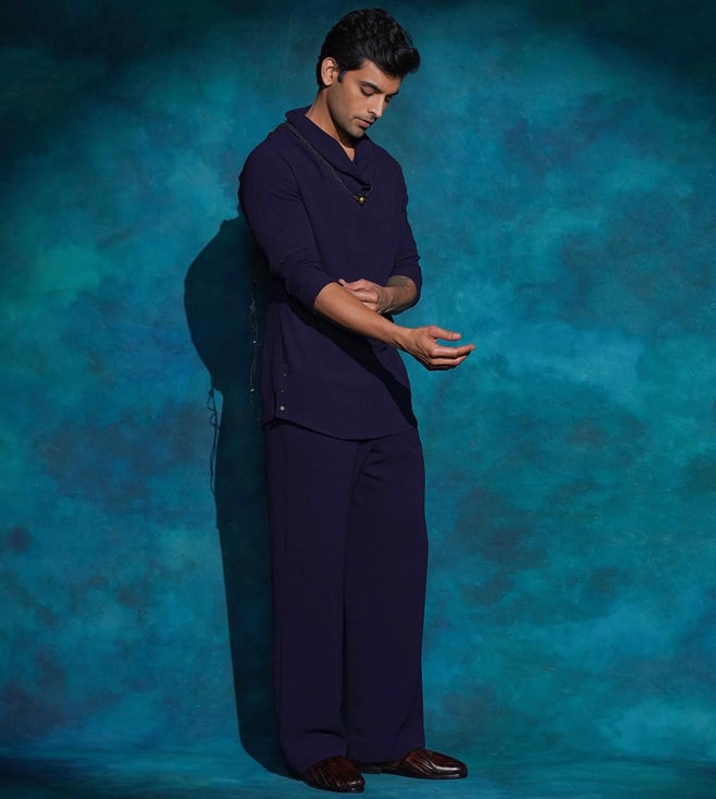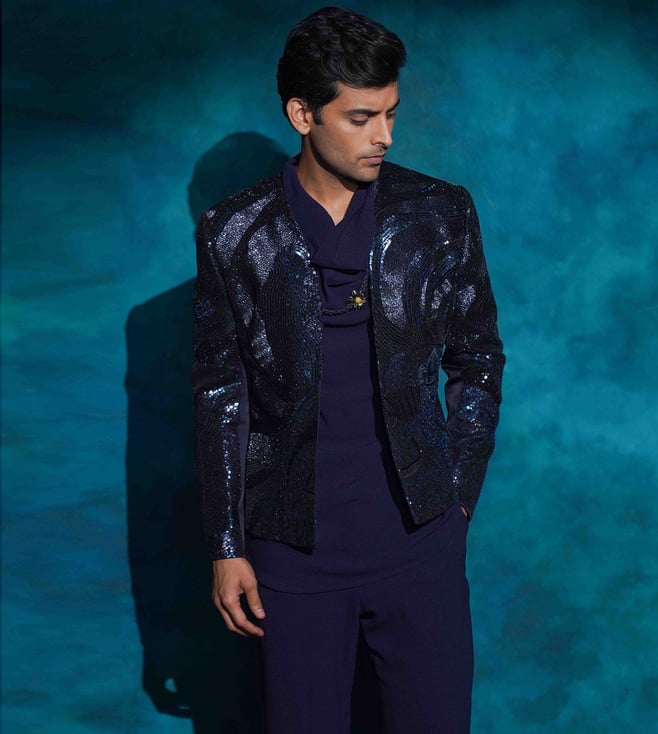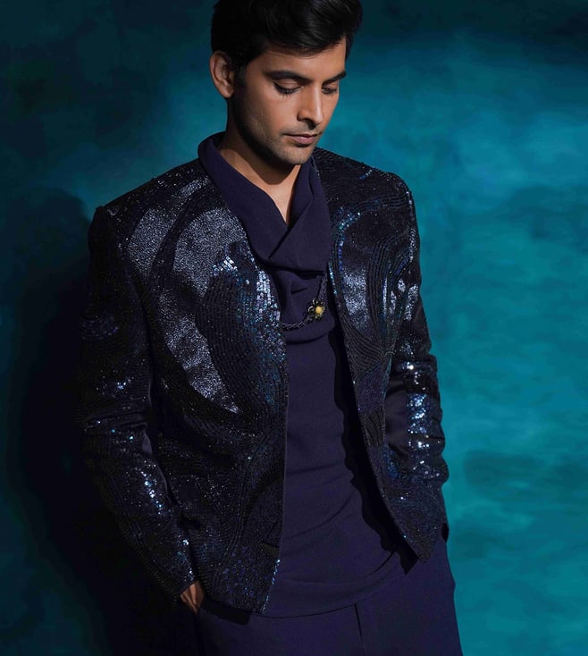 Jatin Malik Midnight Blue Hand Embroidered Blue Sequened Short Jacket Set