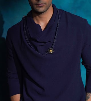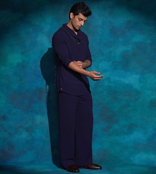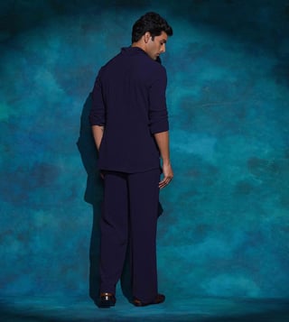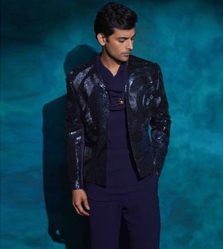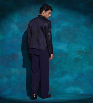 Presenting our short jacket in Midnight Blue from the Shiva Collection. A tribute to Shiva¿s cosmic dance,this piece captures the movement of flowing hair, the rhythm of the damru, and the powerful symbolism of Tandava a dance that embodies creation, destruction, joy, and liberation. The raised and grounded foot reflects moksha and compassion, while the circle of fire symbolizes the eternal cycle of life. Hand-embroidered with layered hues of blue sequins and cutdana, the jacket radiates energy and artistry.