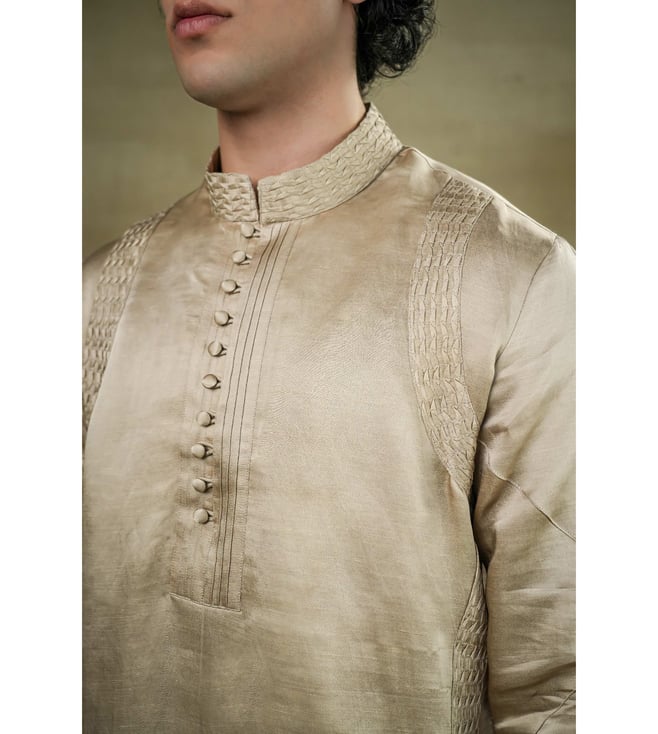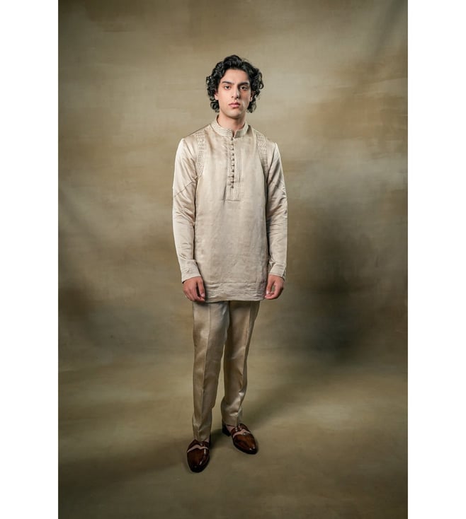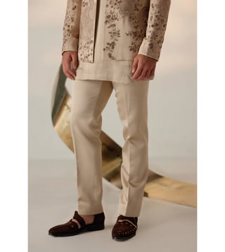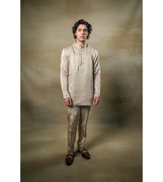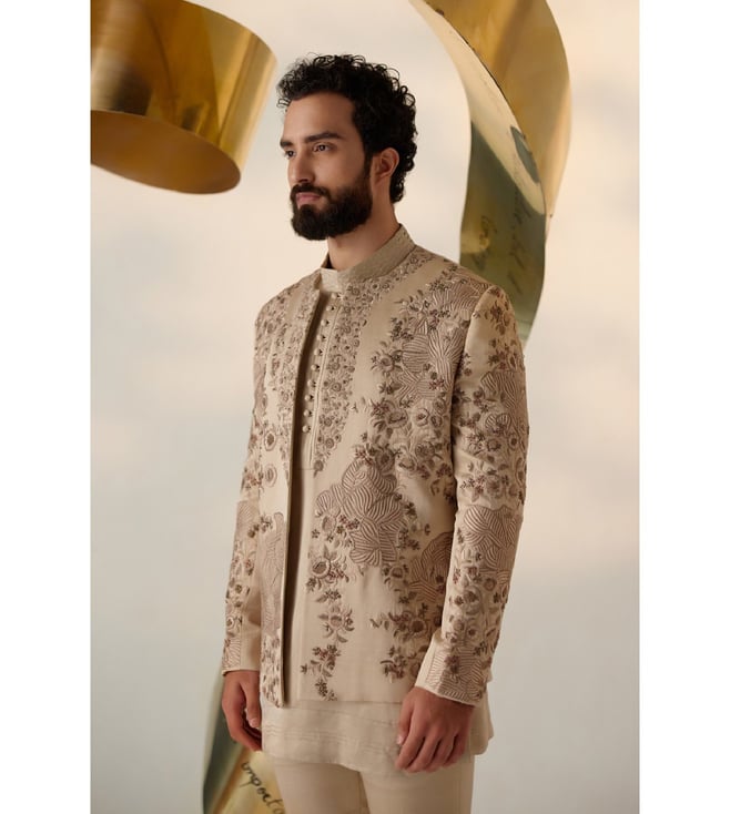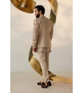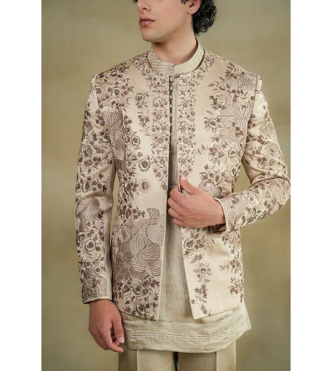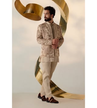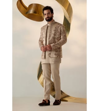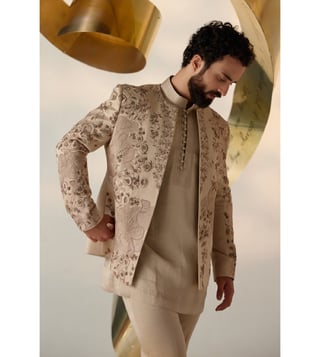 Experience the perfect harmony of tradition and contemporary fashion with this stunning Jacket. Showcasing a magnificent jacket with hand-embroidery details. This sherwani is paired with a matching short kurta and tapered trousers. Disclaimer - The actual color of the product may vary slightly from the image shown. Made-to-order products are non-returnable and non-exchangeable.