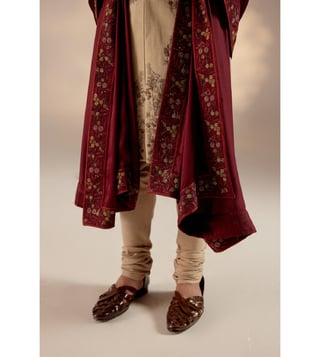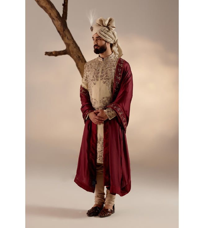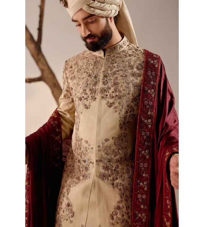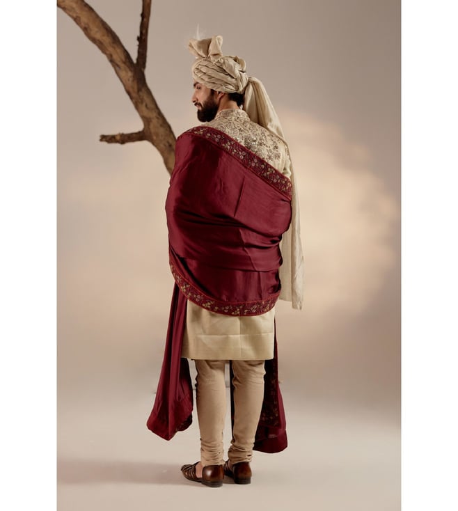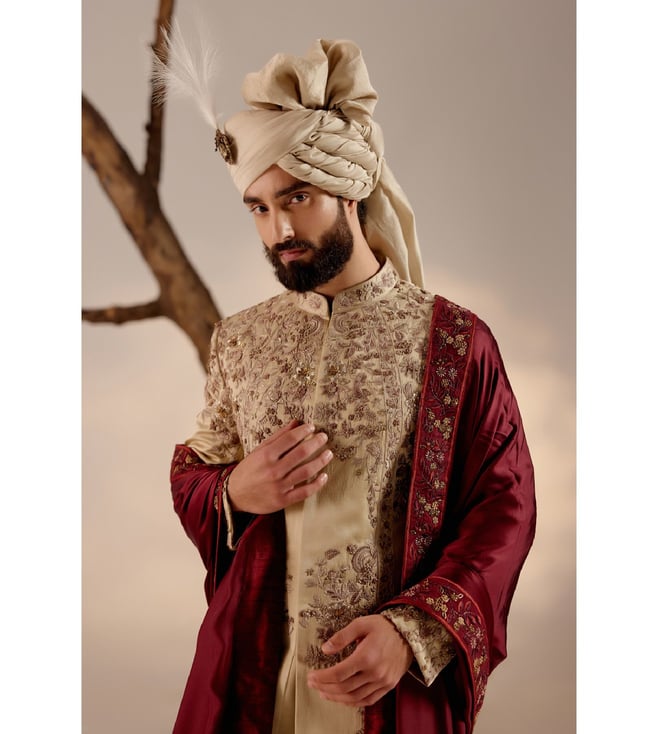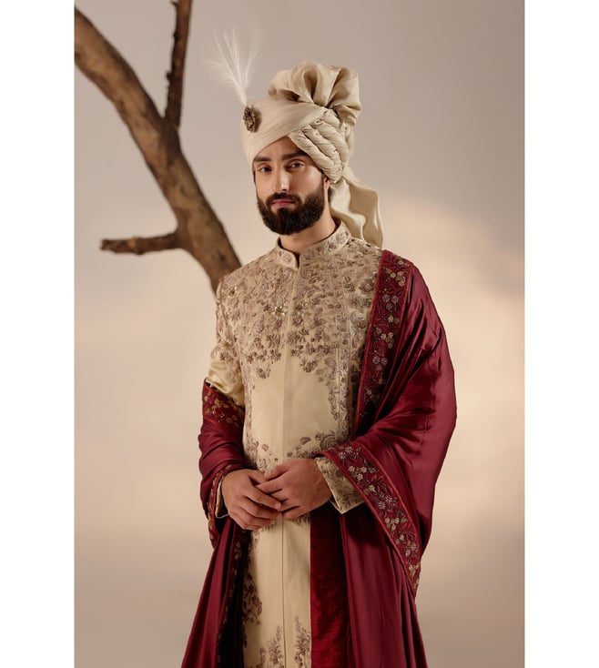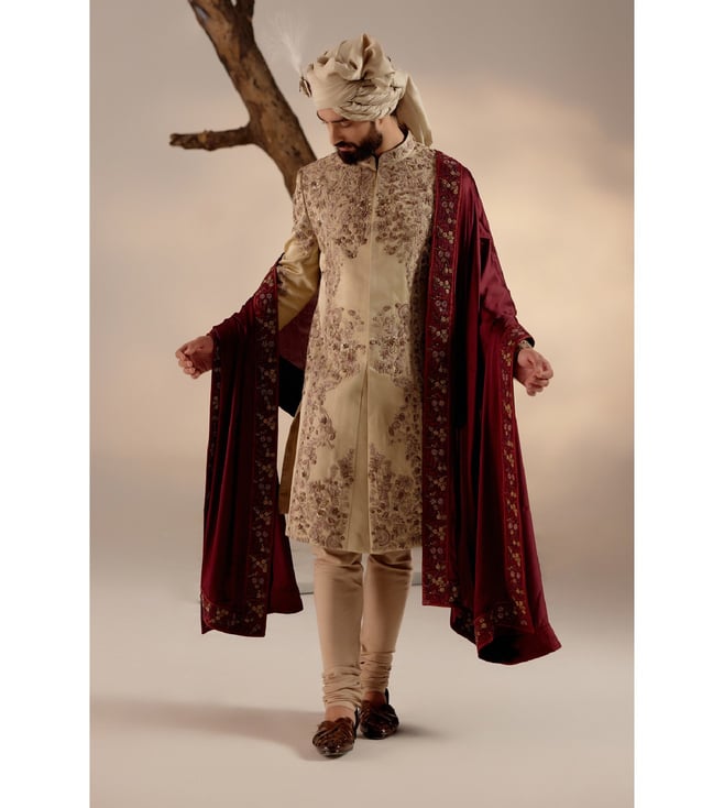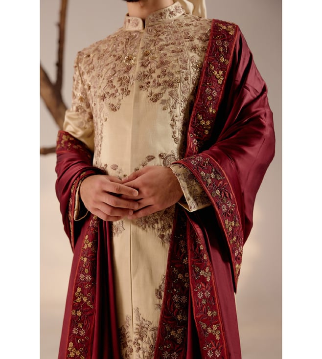 Time to make a grand entrance with this incredible sherwani set with a wine hand-embroidered stole and a matching safa. Featuring work of art it is intricately hand-embroidered with resham, silver threads, dabka and zari, which speaks volumes about your taste for the finer things in life. Disclaimer - The actual color of the product may vary slightly from the image shown. Made-to-order products are non-returnable and non-exchangeable.