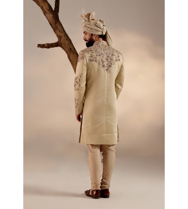Jatin Malik Sand Grey Dali Ridge Embroidered Kurta Churidar Stole & Safa Sherwani Set