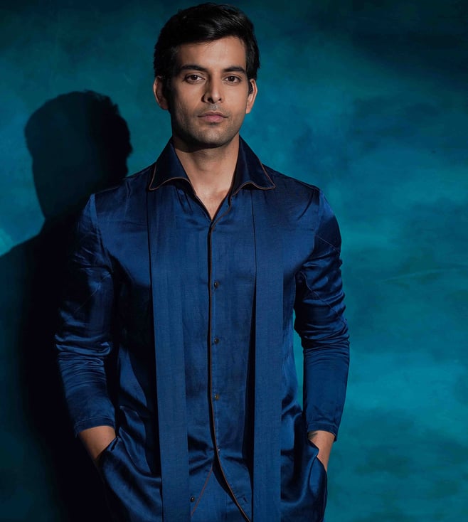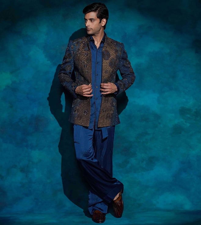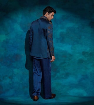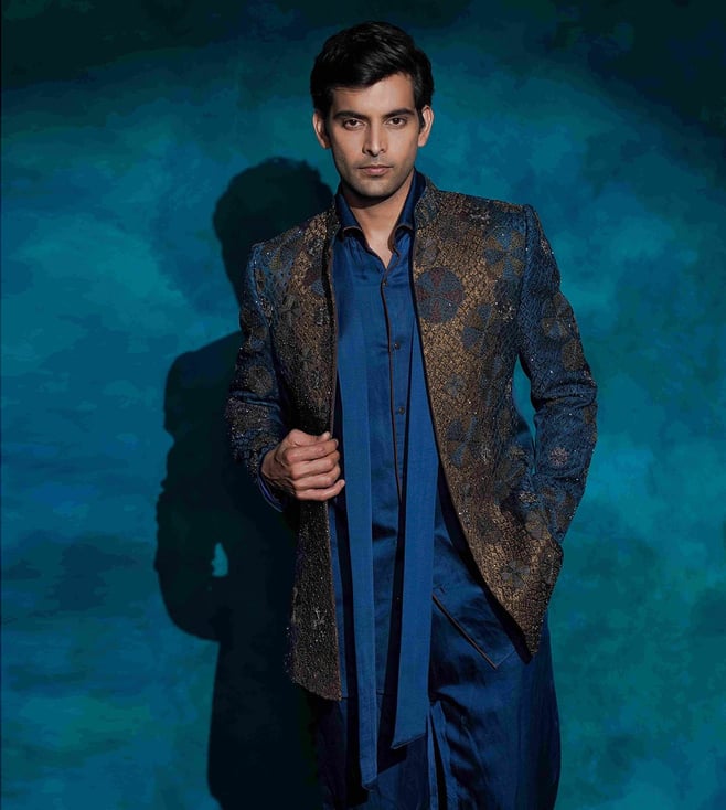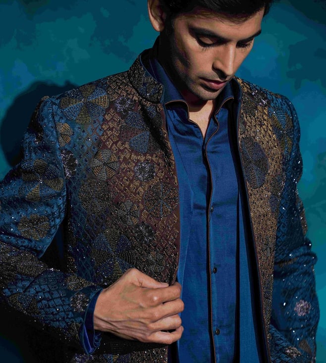 Presenting our open jacket set in a striking Teal and Brown Ombre. Meticulously hand-embroidered with resham, zari, cutdana, and dabka, this ensemble is a tribute to Shiva¿s divine symbolism. The design draws inspiration from Vasuki¿s scales resting on Shiva¿s shoulder, the sacred Rudraksha adorning his neck, and the concealed form of Ardhanarishvara embodying balance and unity. Radiating cosmic energy, ASTRA strikes the perfect harmony between timeless elegance and contemporary bling.