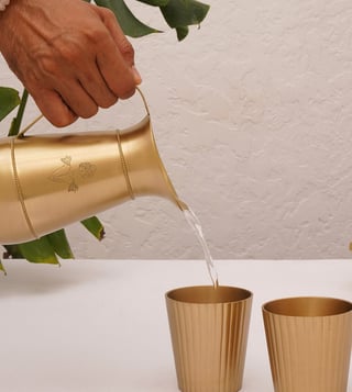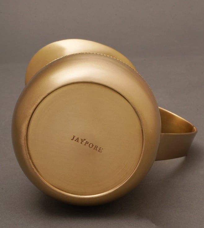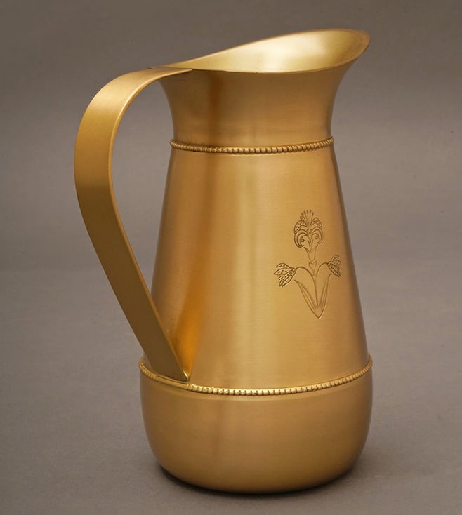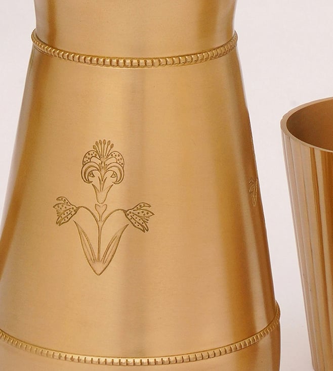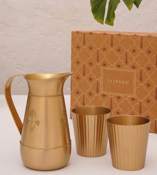 Elevate your dining experience with the Jaypore antique gold hand crafted brass jug and glasses. This exquisite set exudes elegance and charm, perfect for both special occasions and everyday use. Crafted with intricate detailing and a stunning antique gold finish, each piece is a work of art. The jug and glasses are not only visually appealing but also durable and functional, making them a timeless addition to your tableware collection. Impress your guests and add a touch of luxury to your home with this exquisite set.