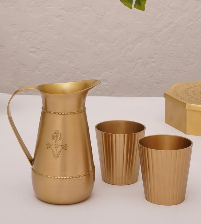 Jaypore Antique Gold Hand Crafted Brass Jug & Glasses