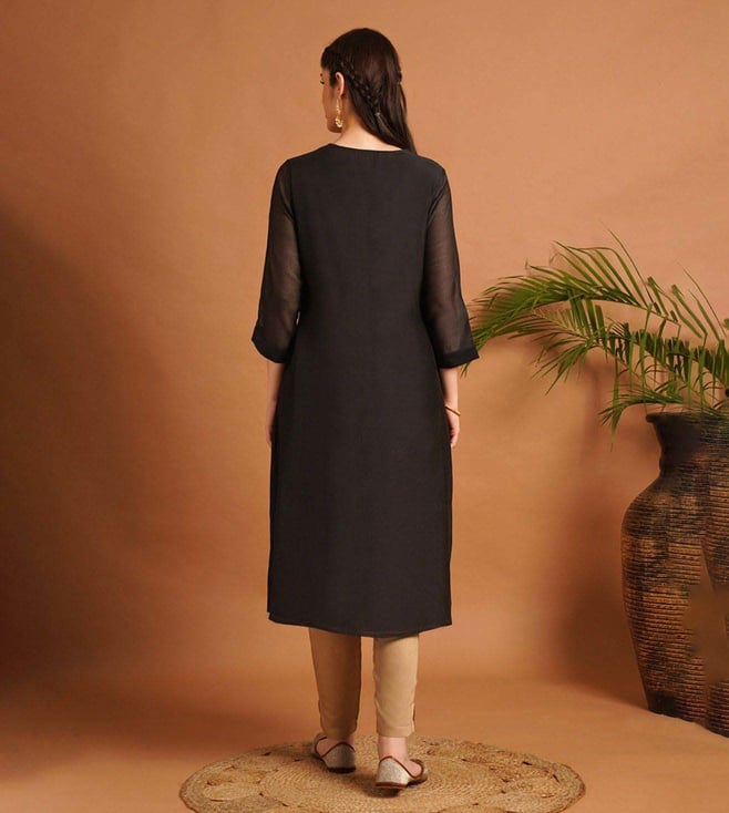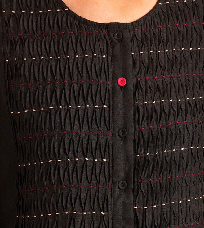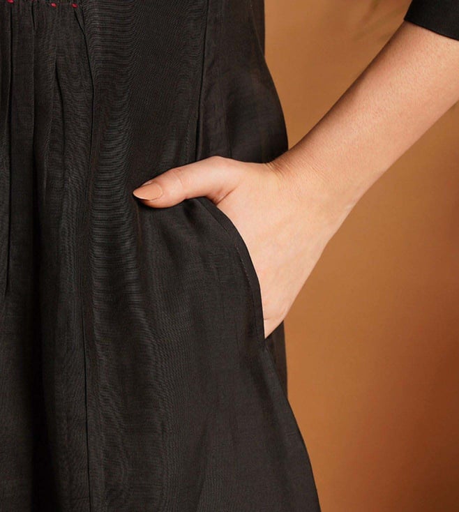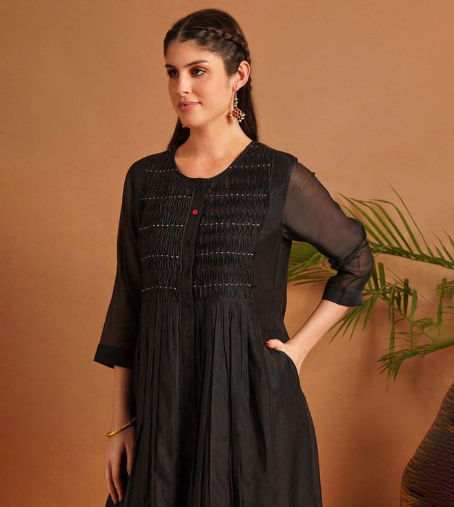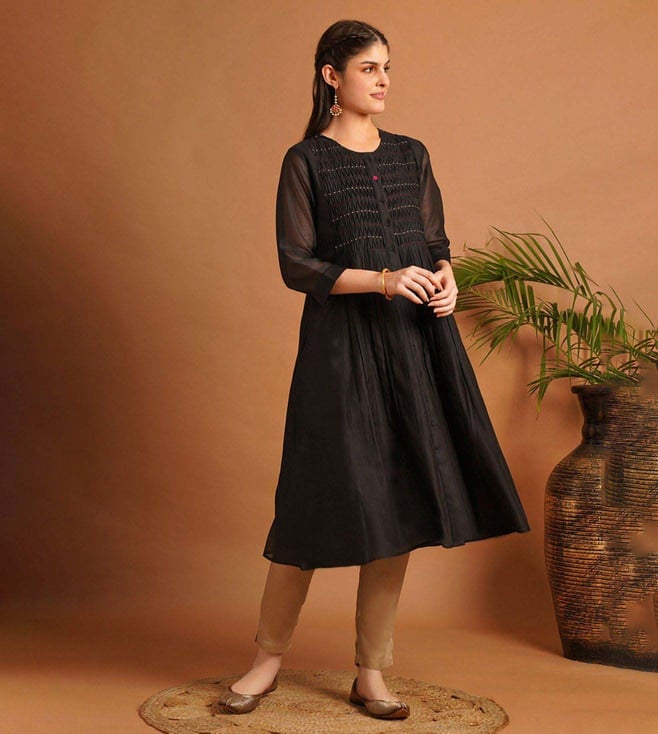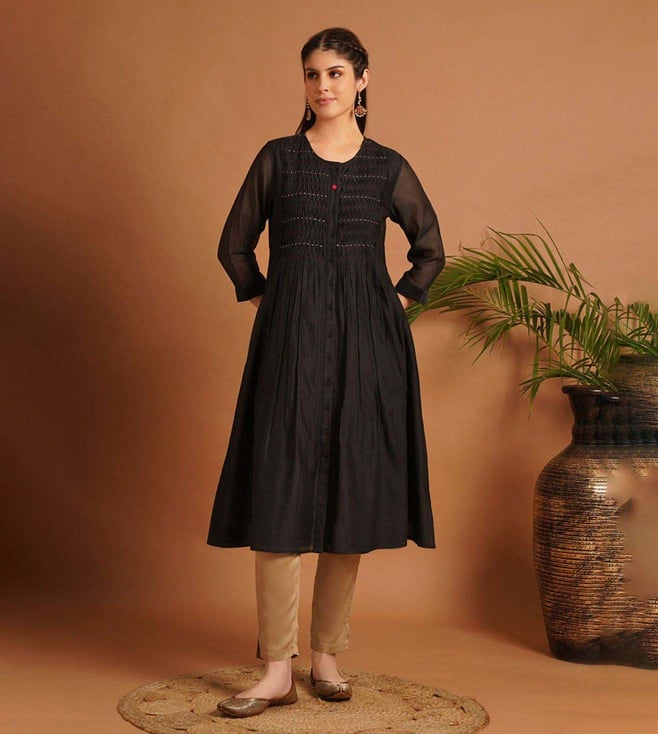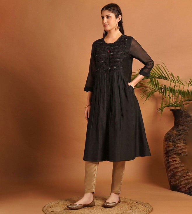 Elevate your everyday style with the Jaypore Black Flare Fit Kurta. Crafted with a flattering flare silhouette, this kurta combines traditional elegance with modern sophistication. The versatile black hue makes it easy to pair with any bottom, while the comfortable fit ensures all day wearability. Whether you're heading to work or a special event, this kurta is sure to make a statement. Embrace timeless beauty and effortless style with the Jaypore Black Flare Fit Kurta.