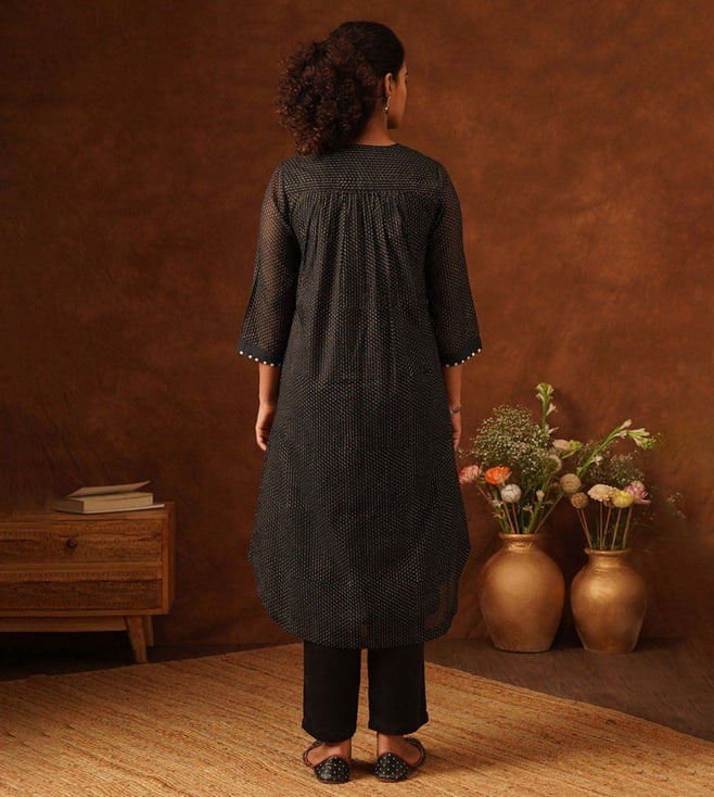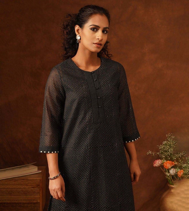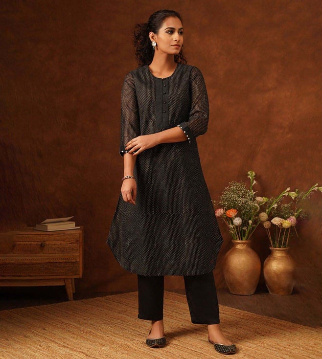 Elevate your style with the Jaypore Black Printed Regular Fit Kurta. Crafted with premium quality fabric, this kurta features a striking black print that adds a touch of elegance to your wardrobe. The regular fit ensures comfort and ease of movement, making it perfect for any occasion. Whether you're heading to work or a special event, this kurta will have you looking effortlessly stylish. Upgrade your look with this versatile and timeless piece that is sure to turn heads wherever you go.