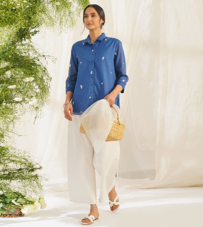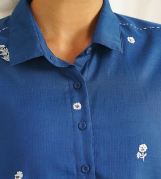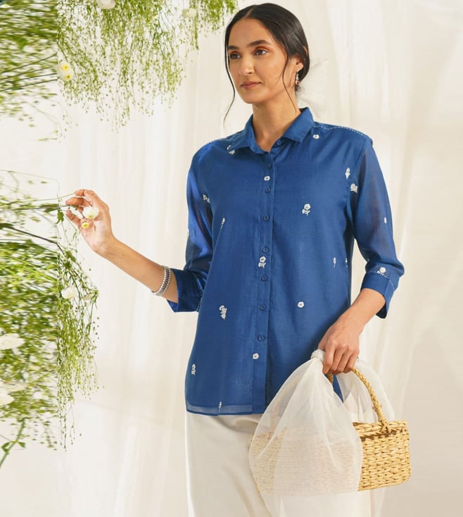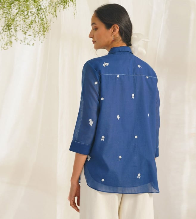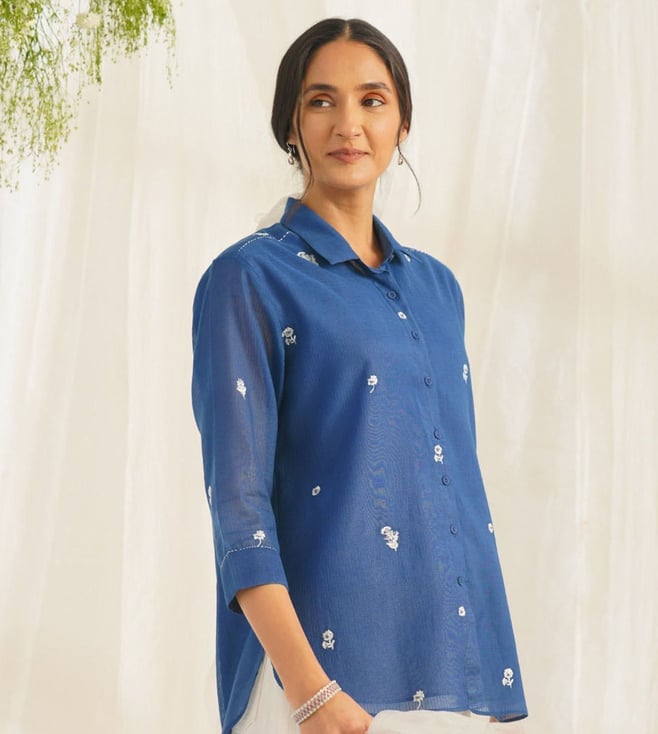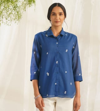 Jaypore Blue Cotton Silk Embroidered Regular Fit Shirt