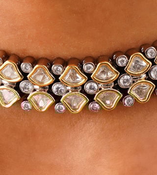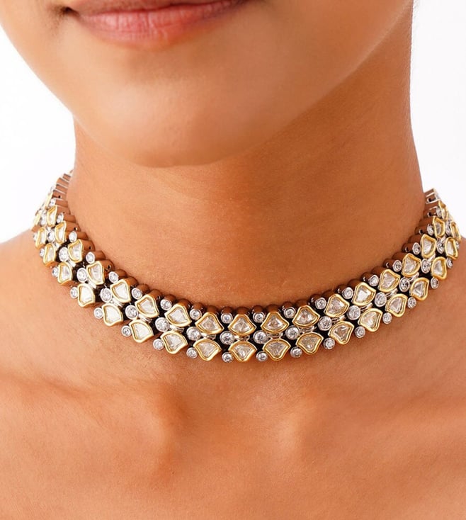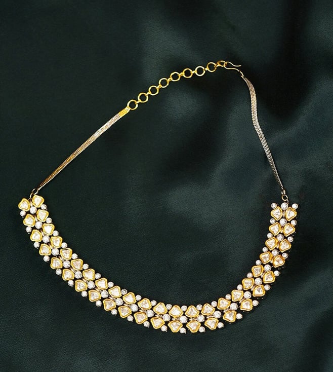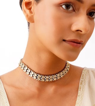 Introducing women kundan brass choker made of the finest brass. This exquisite piece of craftsmanship comes from our kundan polki collection. Bring home a piece of modern indian aesthetic, reflecting kundan crafts. Explore more artisanal finds from our necklace range.