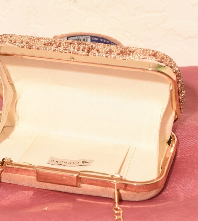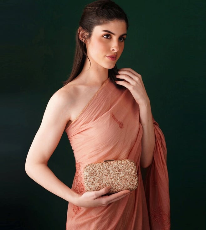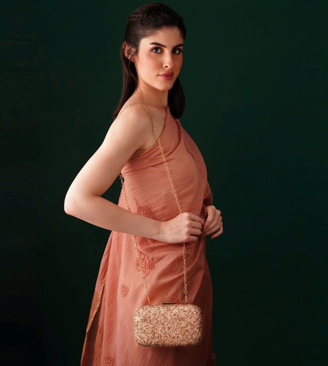 Introducing women gold jacquard clutches made of the finest jacquard. This exquisite piece of craftsmanship comes from this reva collection. Bring home a piece of modern indian aesthetic, reflecting crafts. Explore more artisanal finds from this clutches range.
