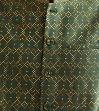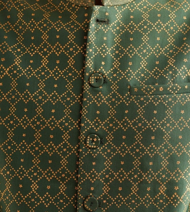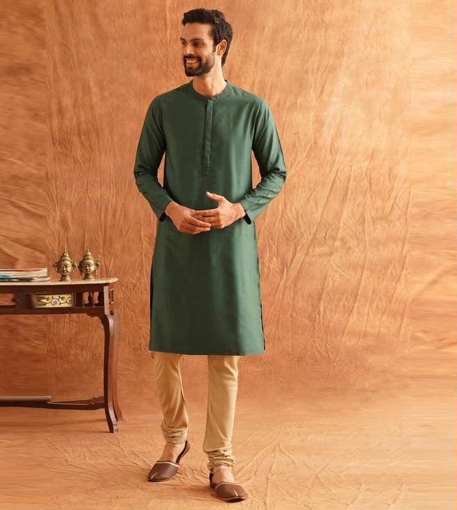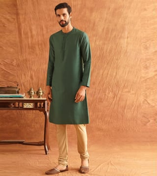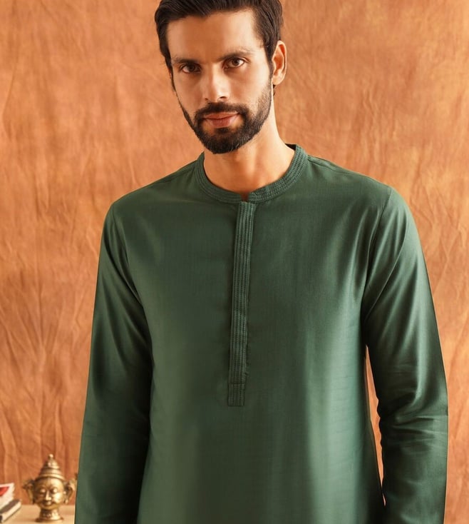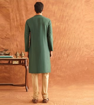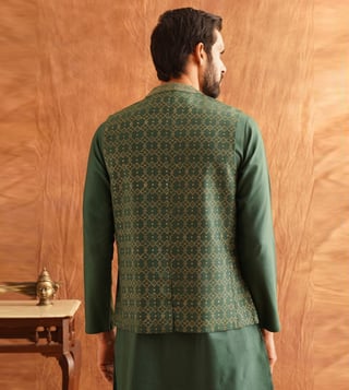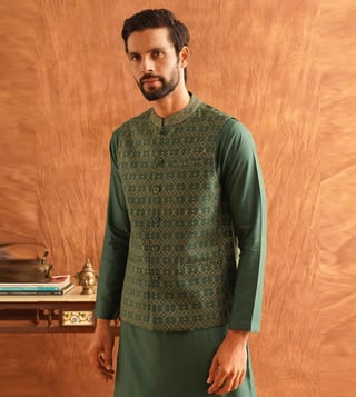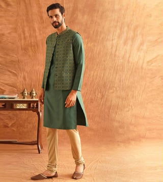 Introducing Men Green Viscose Silk Mandarin Collar Straight Kurta with Bundi made of the finest Tussar Cotton.This exquisite piece of craftsmanship comes from our Utkarsh collection.Bring home a piece of modern Indian aesthetic, reflecting crafts.Explore more artisanal finds from our Kurta Bundi Set range.