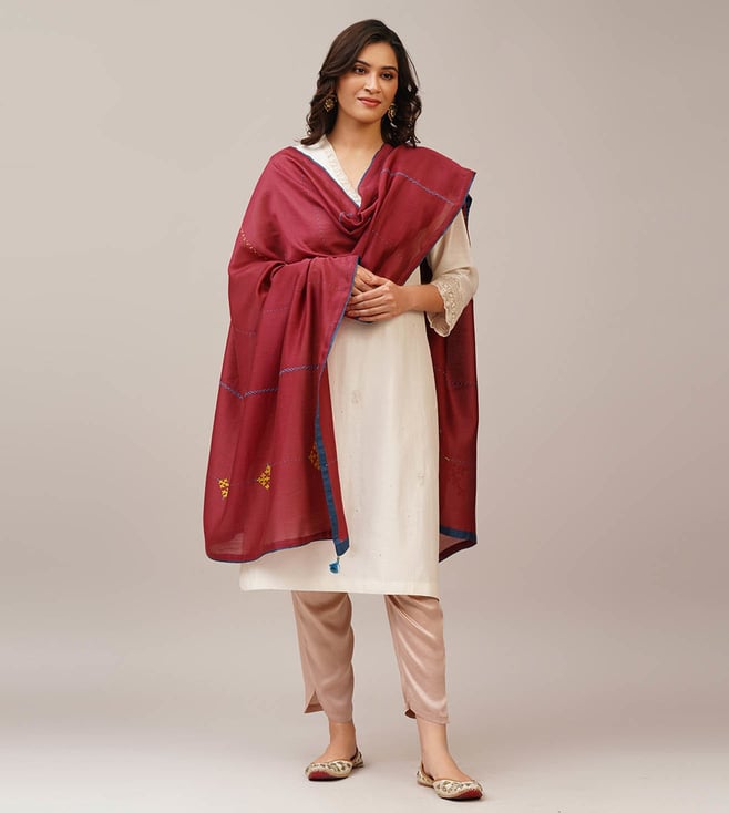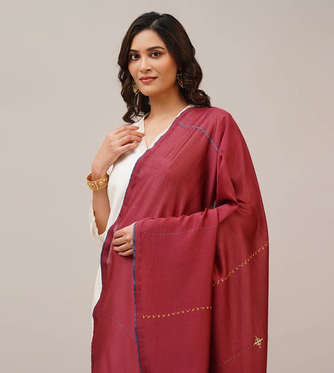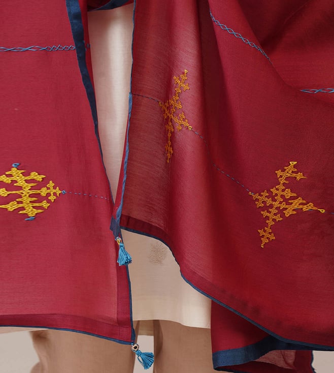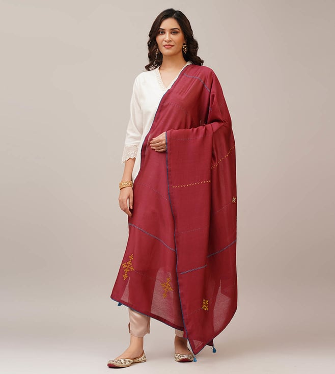 Jaypore Maroon Red Cotton Silk Hand Embroidery Dupatta