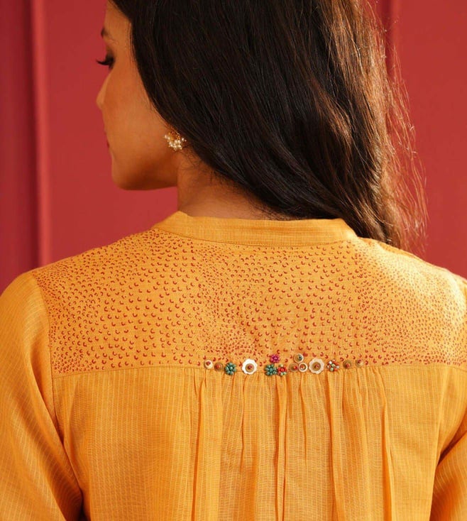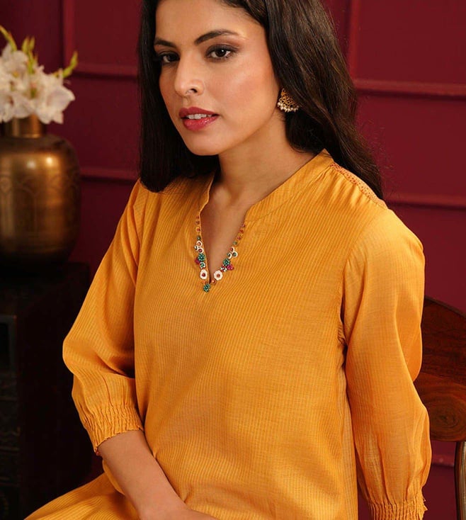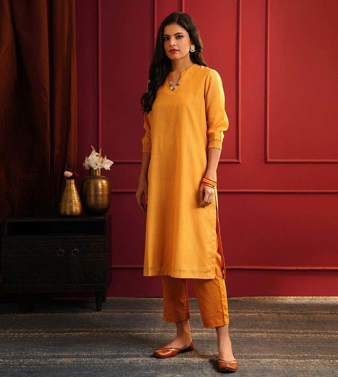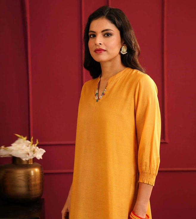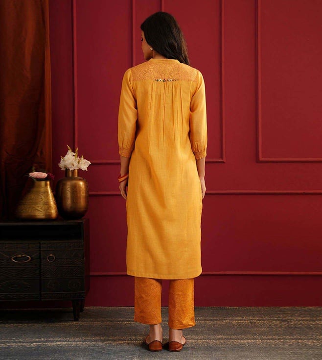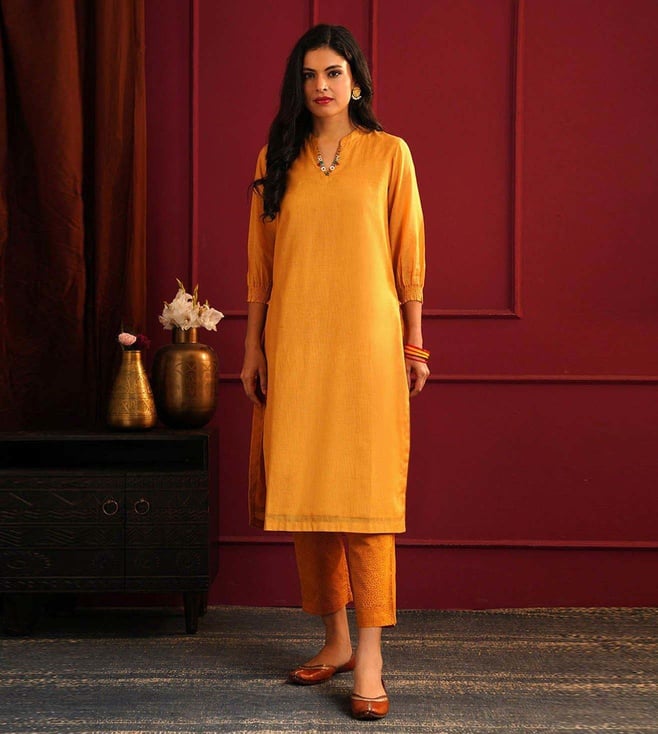 Elevate your style with the Jaypore Mustard Yellow Embroidered Straight Fit Kurta. This beautifully crafted kurta features intricate embroidery detailing, adding a touch of elegance to your wardrobe. The straight fit silhouette ensures a flattering and comfortable fit, perfect for any occasion. Made from high quality fabric, this kurta is not only stylish but also durable. Embrace sophistication and charm with this must have piece that effortlessly combines traditional craftsmanship with modern design. Upgrade your look with the Jaypore Mustard Yellow Embroidered Straight Fit Kurta today.