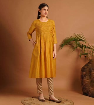 Elevate your ethnic wardrobe with the Jaypore Mustard Yellow Flare Fit Kurta. This stunning piece features a flattering flare fit that drapes beautifully on all body types, while the vibrant mustard yellow color adds a pop of sunshine to your look. Crafted from high quality fabric, this kurta is not only stylish but also comfortable for all day wear. Perfect for any occasion, from casual outings to festive celebrations, this versatile piece is a must have for every fashion forward individual looking to make a statement with their style.
