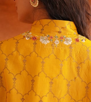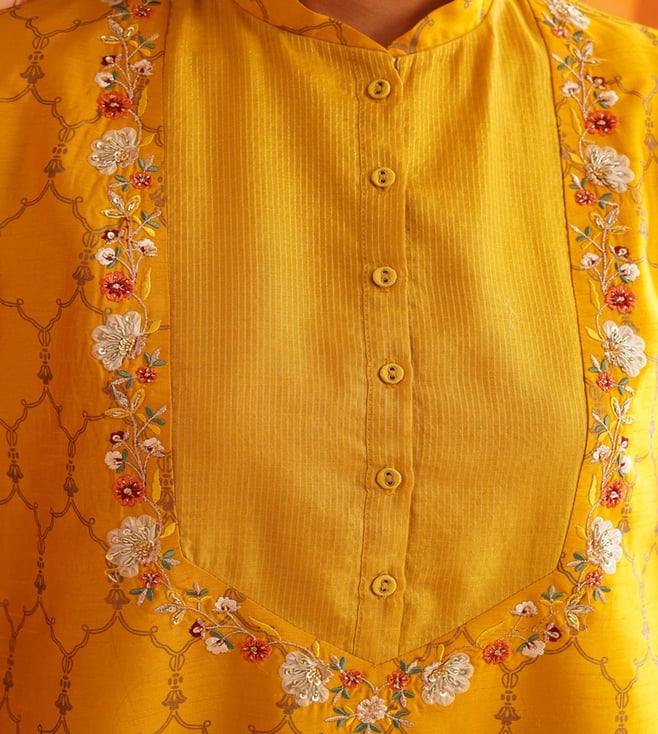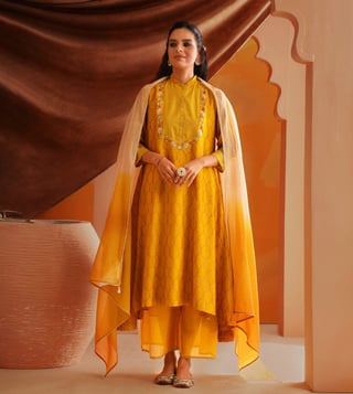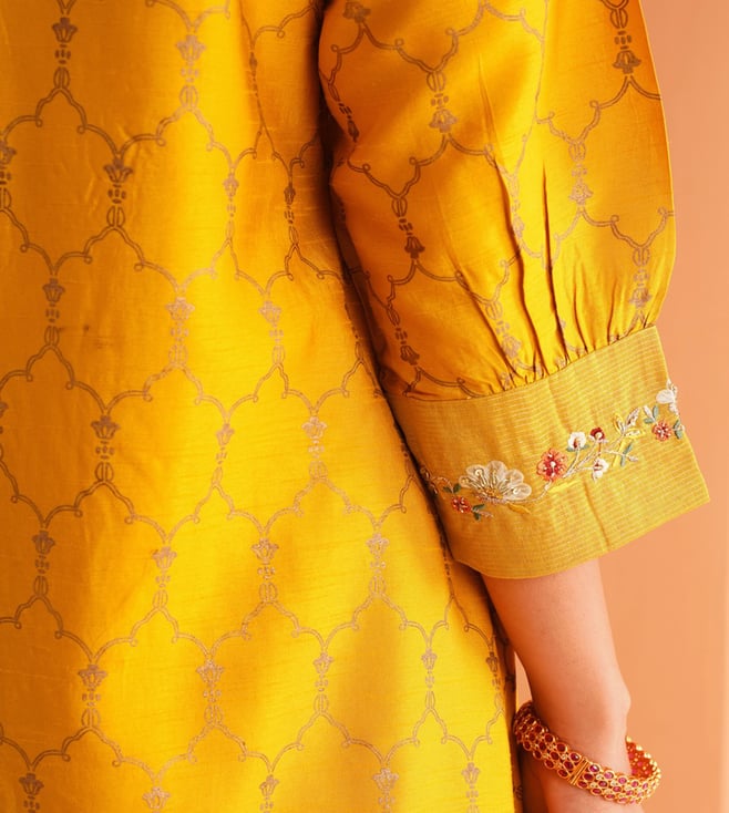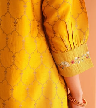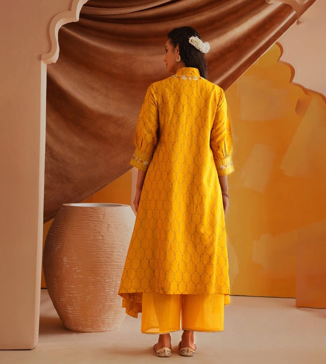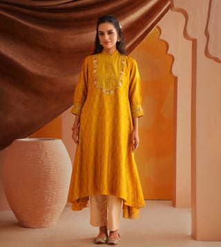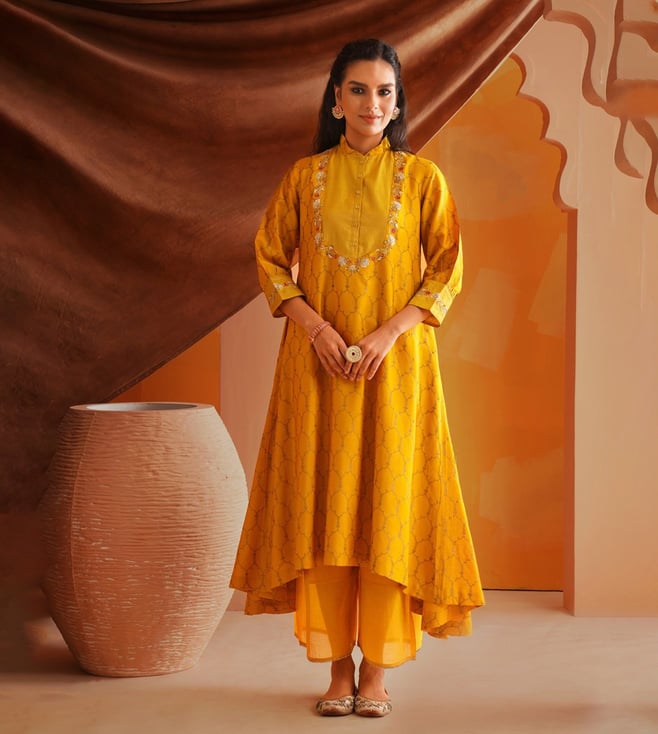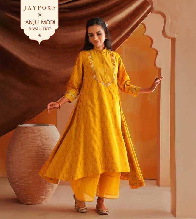 Introducing women's mustard yellow viscose dupion hand embroidery kurta and pants set made of the finest viscose dupion. This exquisite piece of craftsmanship comes from Jaypore x Anju Modi collection. Bring home a piece of modern Indian aesthetic, reflecting hand embroidery crafts. Explore more artisanal finds from kurta set range.