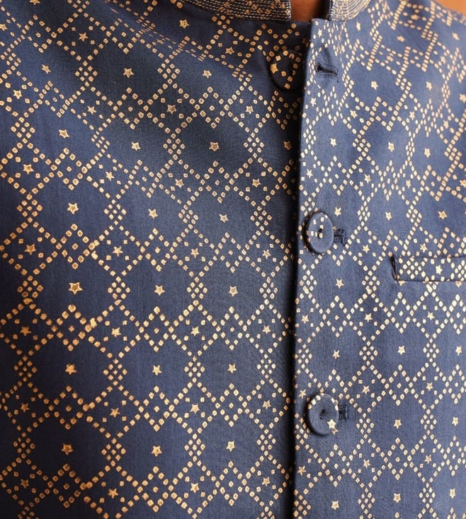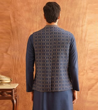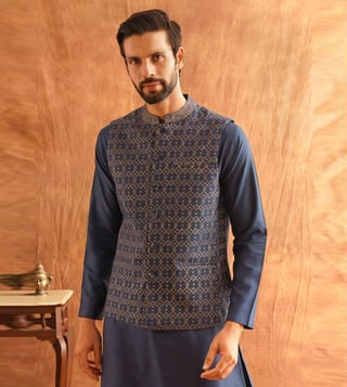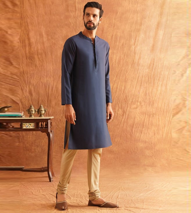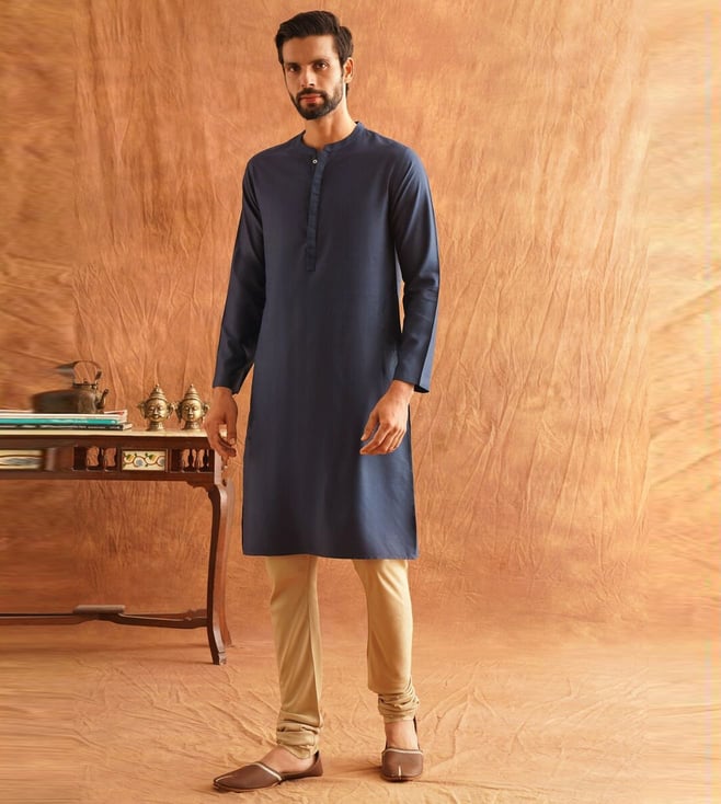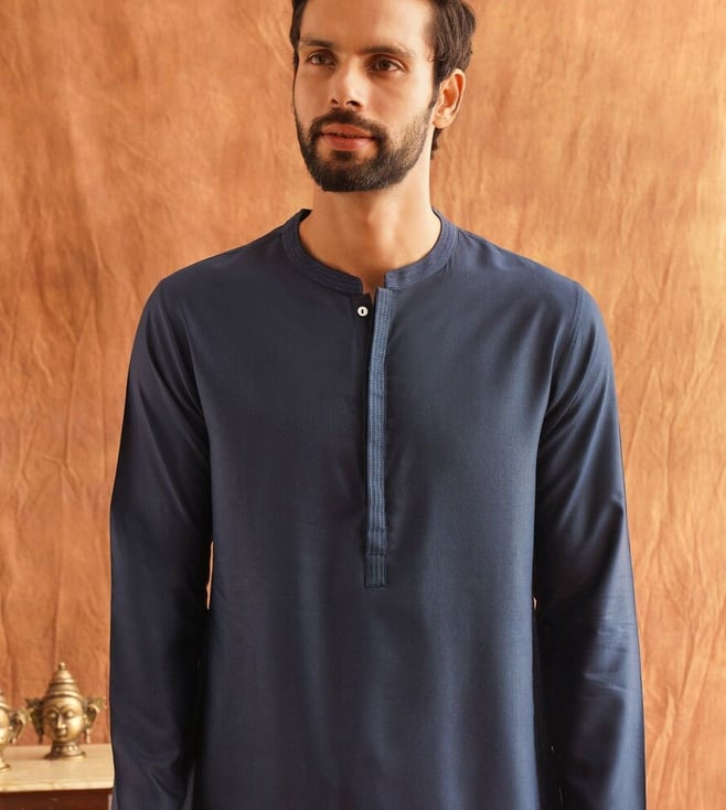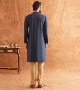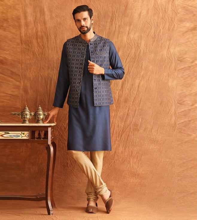 Introducing Men Navy Blue Viscose Silk Mandarin Collar Straight Kurta with Bundi made of the finest Tussar Cotton.This exquisite piece of craftsmanship comes from our Utkarsh collection.Bring home a piece of modern Indian aesthetic, reflecting crafts.Explore more artisanal finds from our Kurta Bundi Set range.