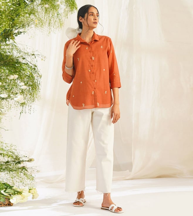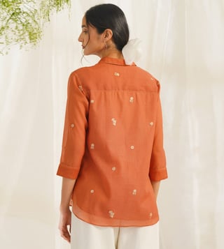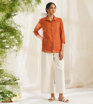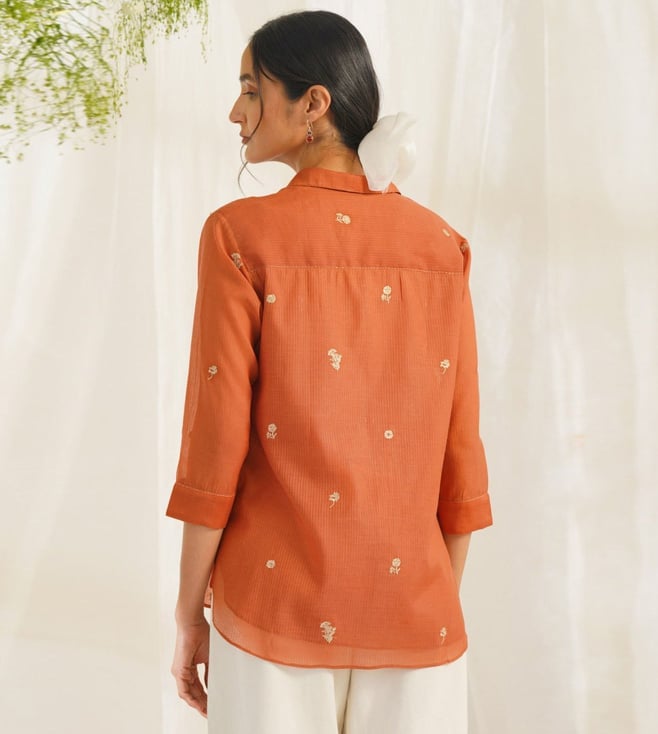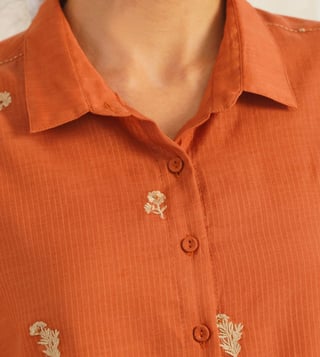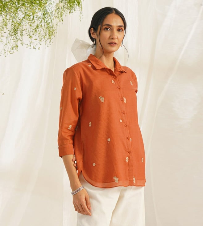 Jaypore Rust Orange Cotton Silk Embroidered Regular Fit Shirt
