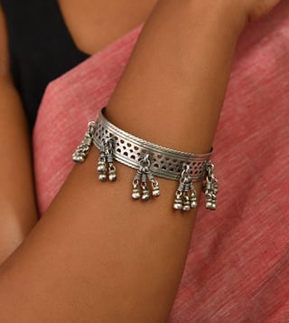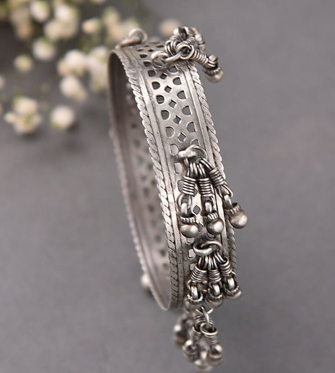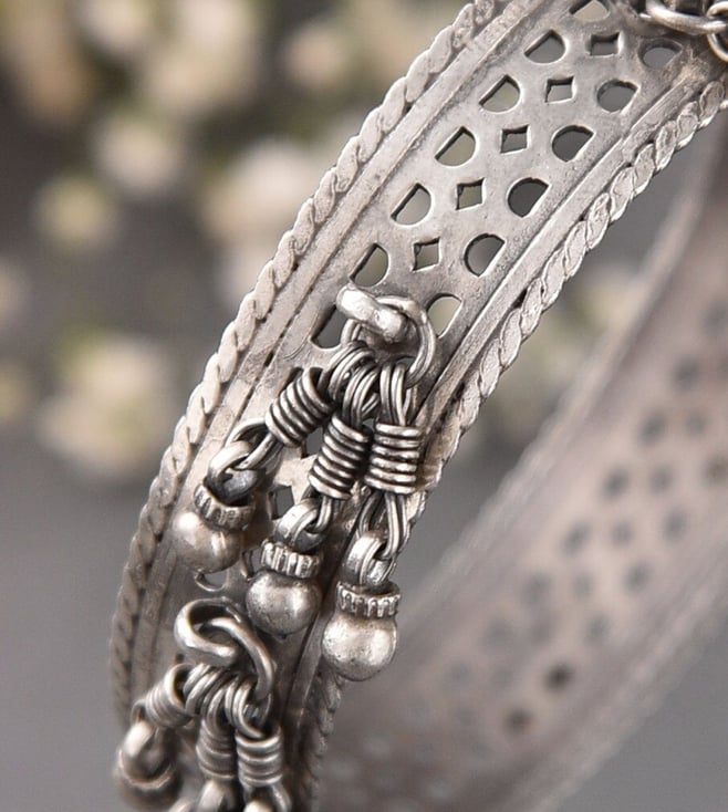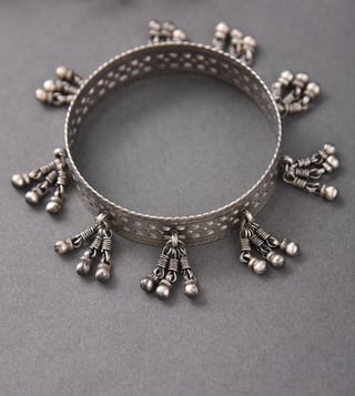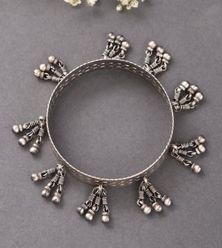 Introducing women silver non adjustable silver bangles made of the finest silver. This exquisite piece of craftsmanship comes from our tribal collection. Bring home a piece of modern indian aesthetic, reflecting tribal crafts. Explore more artisanal finds from our bangles range.