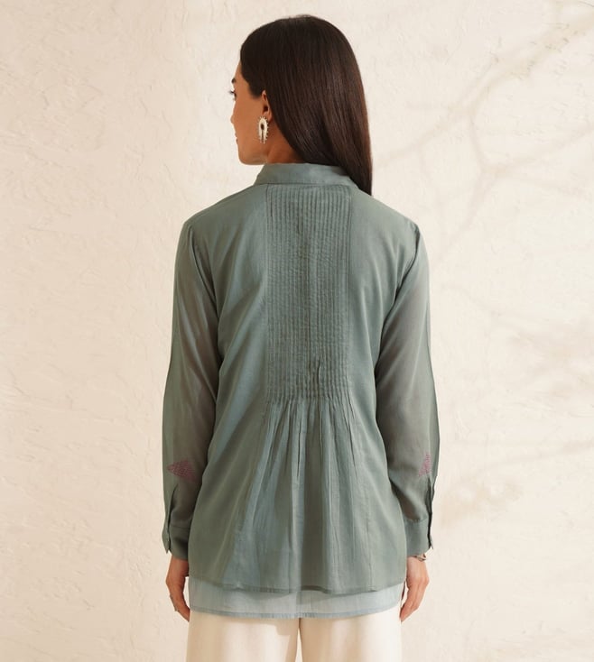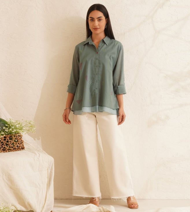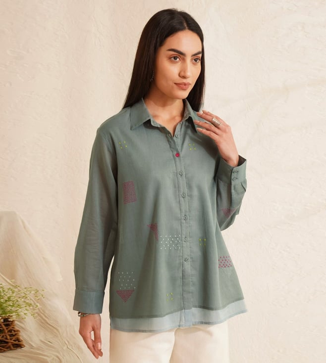 Jaypore Teal Blue Cotton Hand Embroidered Shirt