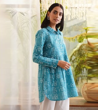 Elevate your everyday style with the Jaypore Teal Blue Printed Regular Fit Top. Crafted with soft, breathable fabric, this top offers a comfortable and flattering fit for all-day wear. The eye-catching teal blue print adds a touch of bohemian flair, perfect for adding a pop of color to your wardrobe. Versatile and easy to style, this top is a must-have for any fashion-forward individual looking to effortlessly elevate their look. Make a statement with the Jaypore Teal Blue Printed Regular Fit Top.