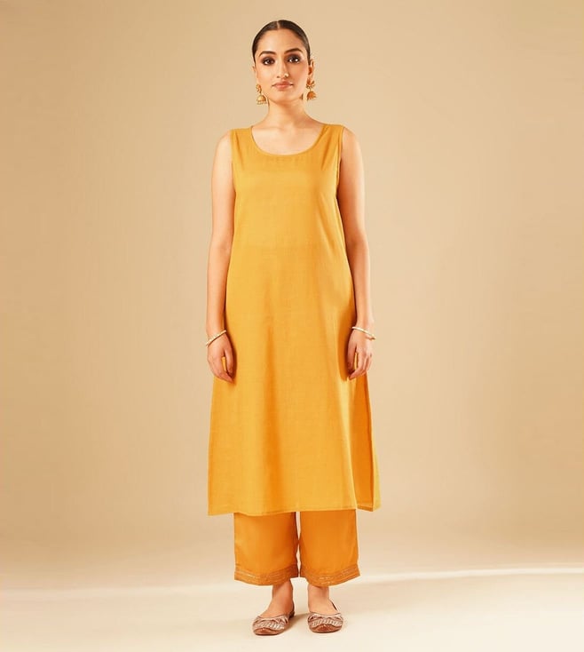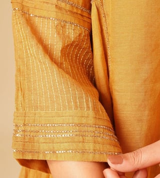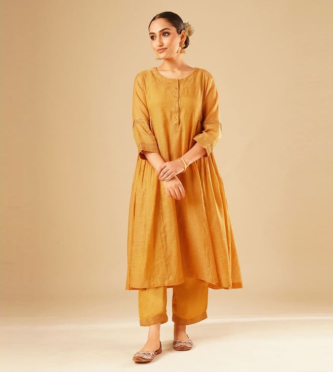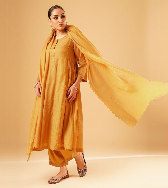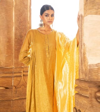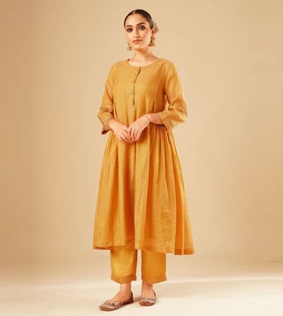 Elevate your festive wardrobe with the Jaypore women mustard yellow hand embroidered loose fit kurta. Crafted from a luxurious blend, this kurta features intricate hand embroidery that adds a touch of elegance to any outfit. The loose fit and three-quarter sleeves offer comfort and ease of movement, while the round neck adds a classic touch. Perfect for special occasions or everyday wear, this kurta effortlessly blends style and comfort for the modern woman. Stand out in style with this must-have addition to your wardrobe.