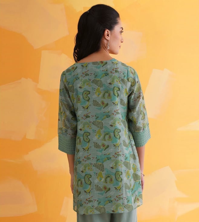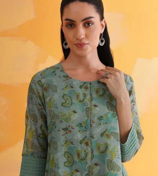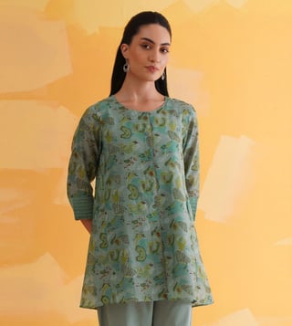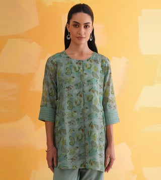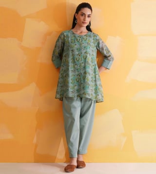Elevate your festive wardrobe with our Jaypore women teal blue block printed flared fit tunic. Made from a luxurious blend, this tunic features a flattering flared fit, three-quarter sleeves, and a classic round neck design. The intricate block print adds a touch of elegance, making it perfect for any special occasion. With its vibrant teal blue hue, this tunic is sure to turn heads and make you feel confident and stylish. Add a pop of color and sophistication to your ensemble with this must-have piece.