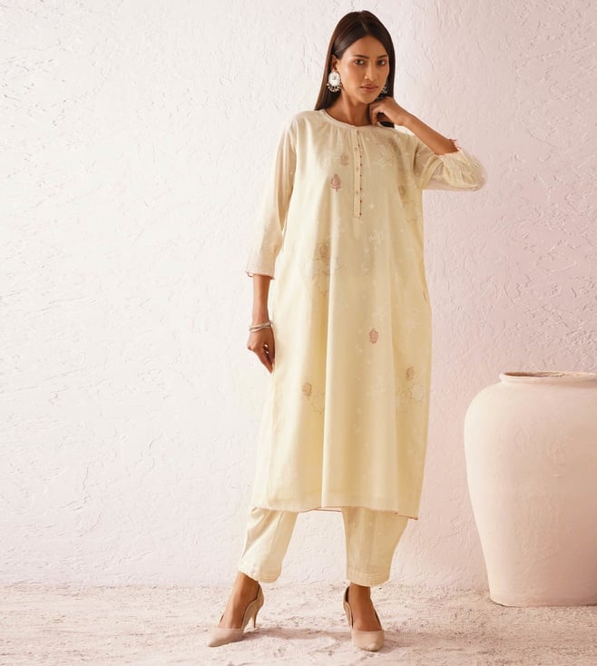 Off White Cream Cotton Block Printed Flare Fit Kurta
