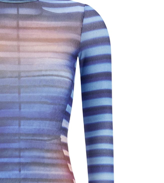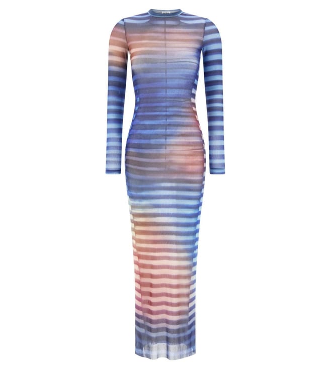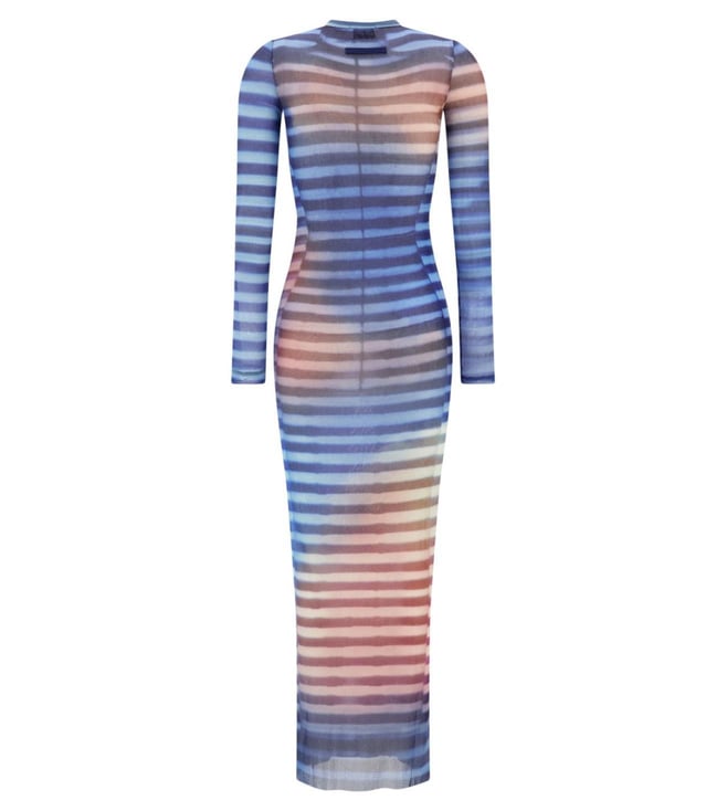 Dive into elegance with this striking blue dress, adorned with a captivating striped pattern that dances across its surface. Crafted from 100% polyamide, it offers a luxurious feel and a flattering silhouette. The long sleeves provide a touch of sophistication, while the round neck adds a classic charm. Designed for the modern woman, this dress features a seamless closure, ensuring a sleek finish. Perfect for any occasion, it effortlessly combines style and comfort, making it a wardrobe essential.