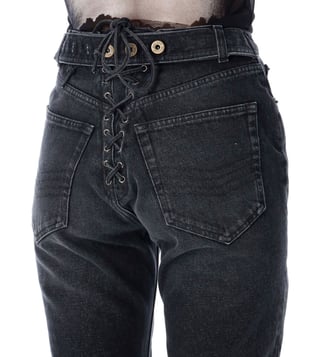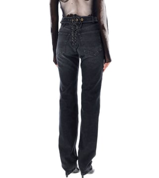 Elevate your wardrobe with the Jean Paul Gaultier Charcoal Geometric Regular Fit Jeans. Designed with belt loops, five-pocket styling, zip-fly, zip vent at cuffs, adjustable button-tab at back waistband, lace-up detailing at back, logo-engraved silver-tone hardware, composition: 100% cotton, these trousers combine comfort and sophistication for everyday wear.