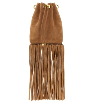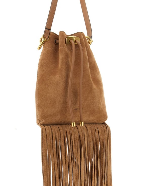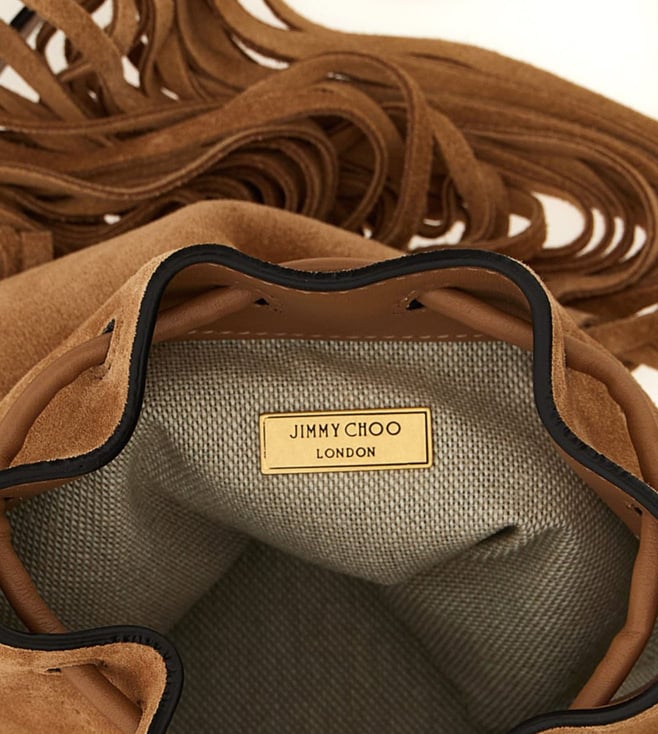 Expand the collection of your accessories in a trendy way with this bag from Jimmy Choo. Brown cinch mini bucket bag in suede with cascading fringes, drawstring closure with diamond metal clip, adjustable and removable shoulder strap. Products purchased from Darveys are supported exclusively by the warranty/exchange policies of Darveys and its partner boutiques. Brand owners and their channel partners are not responsible for exchange/warranty services for items purchased through Darveys.