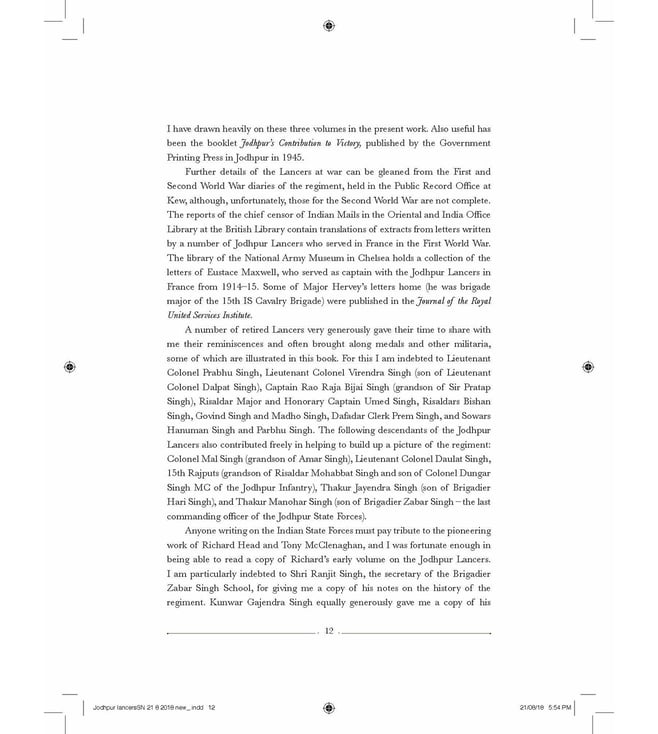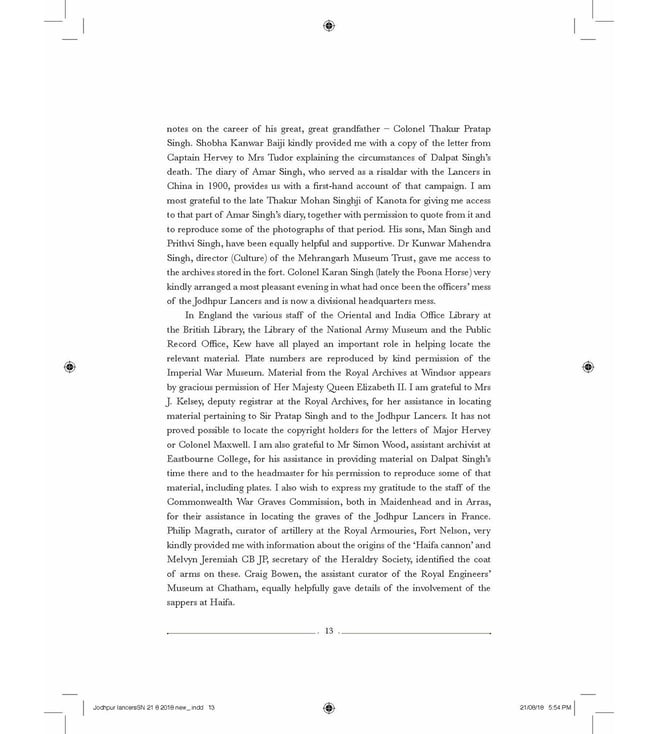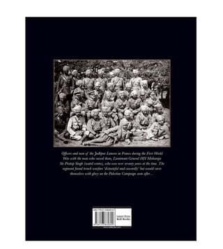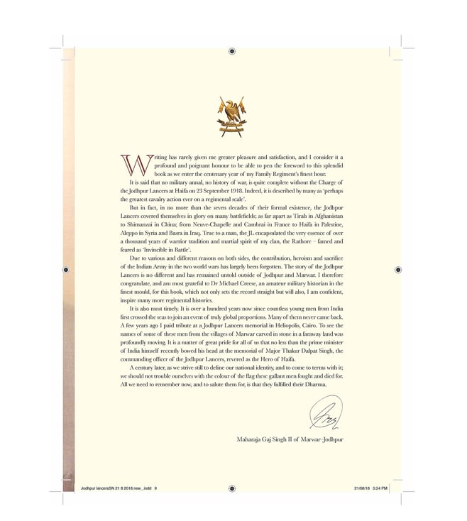 This book is the story of the magnificent Jodhpur Lancers one of India's most charismatic cavalry regiments even as centenary celebrations begin of their finest hour, their extraordinary victory at the Battle of Haifa in 1918. Indeed, the charge, mounted on horses against machine gun fire, at the fortified city then held by German and Turkish forces, is described by many as perhaps the greatest cavalry charge ever on a regimental scale, ranking alongside Cromwell's Ironsides at Marston Moor, the Polish Lancers at Somosierra and the German cavalry at Mars-la-Tour.
