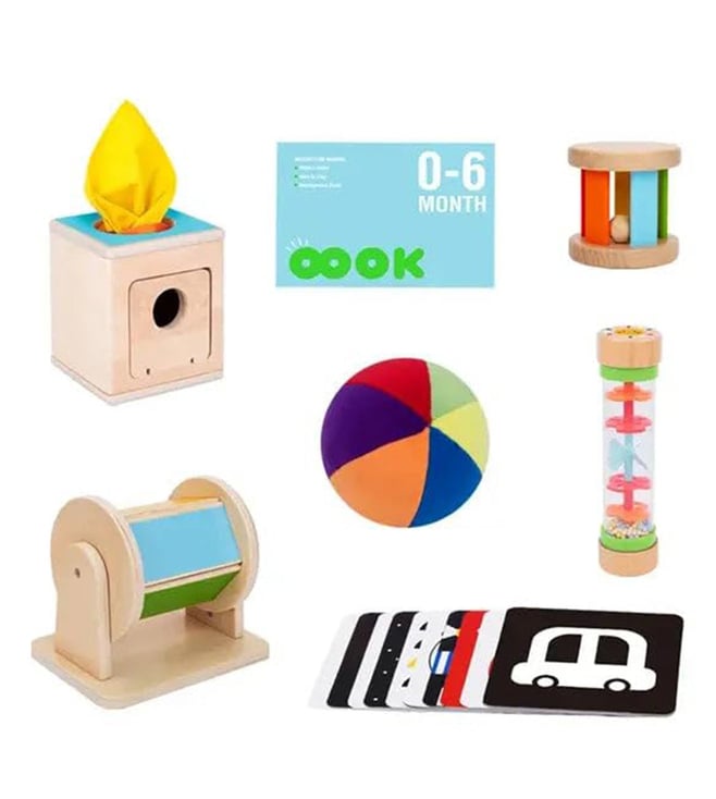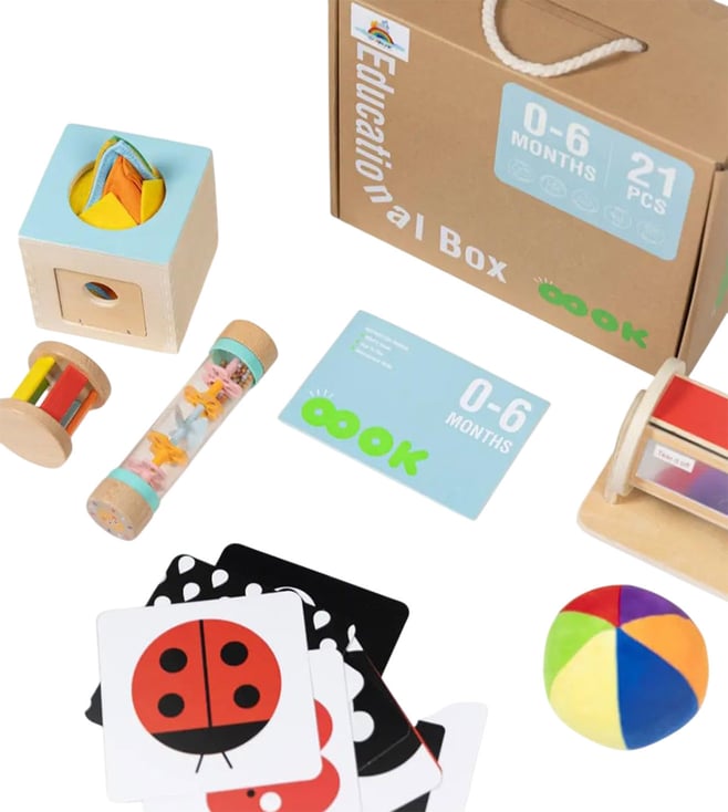 Experience a world of learning with this educational toy box. This thoughtfully curated collection stimulates cognitive and sensory development with colorful rattles for hand-eye coordination and soft, textured toys for tactile exploration. Designed for brain development, it features diverse textures, colors, and shapes that encourage sensory discovery. Crafted from top-quality, safe materials, this set ensures a secure and enriching playtime experience while fostering essential developmental milestones.