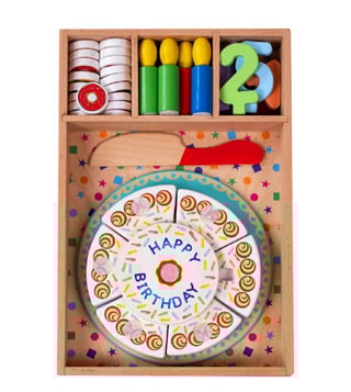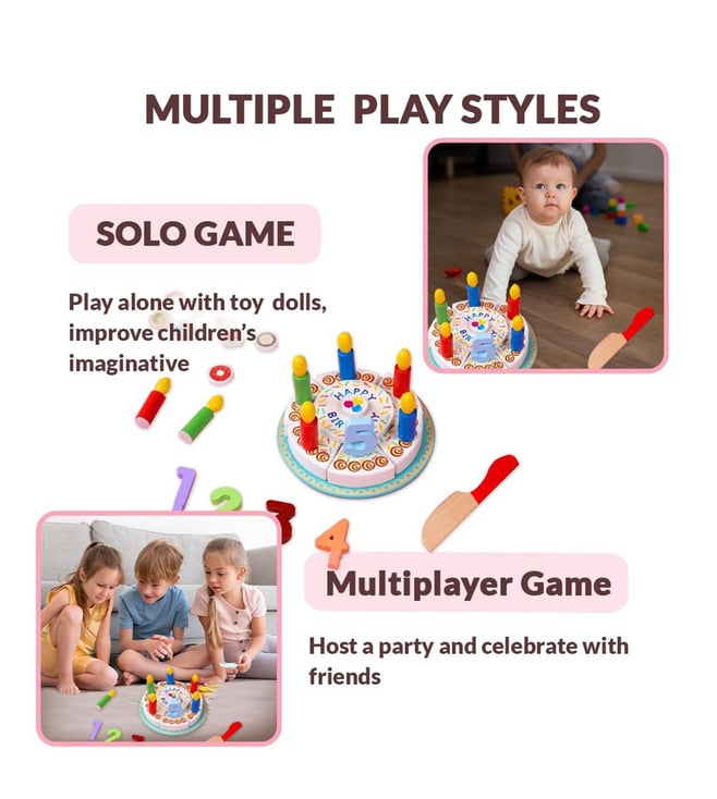 Make learning fun with this charming birthday cake toy, designed to blend play and education seamlessly. Painted with vibrant, non-toxic colors, its stackable layers help develop fine motor skills while teaching fractions through six removable pieces. The set includes five numbered candles for age representation or basic math practice, plus 18 toppings and seven candles that double as a memory match game. Encouraging imaginative play, this durable toy features smooth edges for safe, worry-free fun, ensuring a high-quality experience for your child.