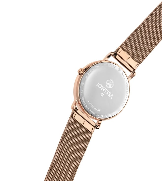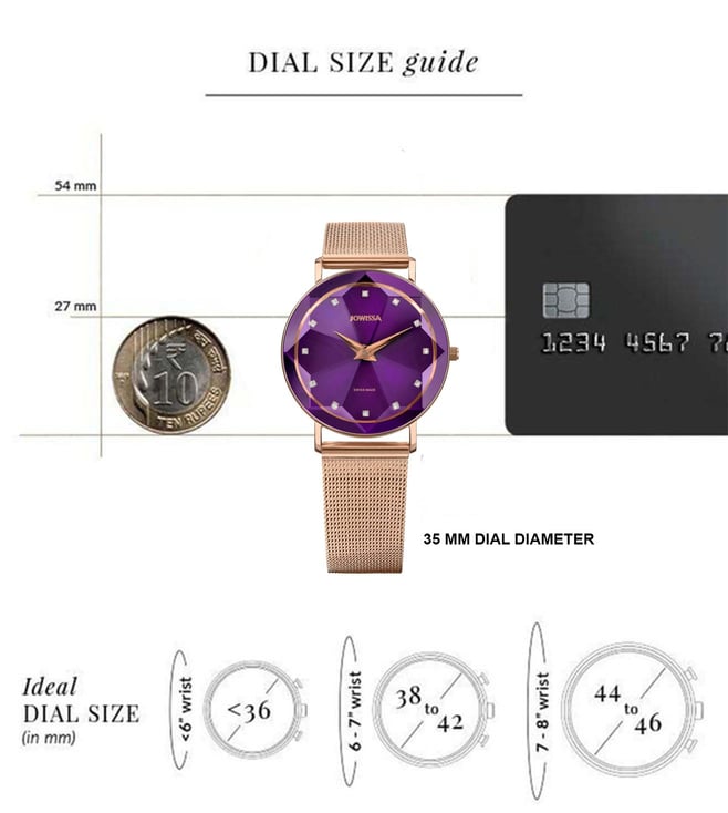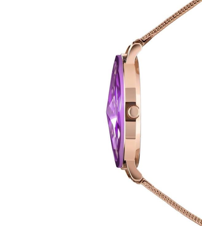 This latest mesh bracelet watch stands out with its rich purple sunray dial, polished 35 mm case, and diamond-cut crystal. Rose-gold accents including a mesh band add luxurious detail. Made in Switzerland, this reliable timepiece has a jewelry look and feel about it when you want to dress up and look beautiful.