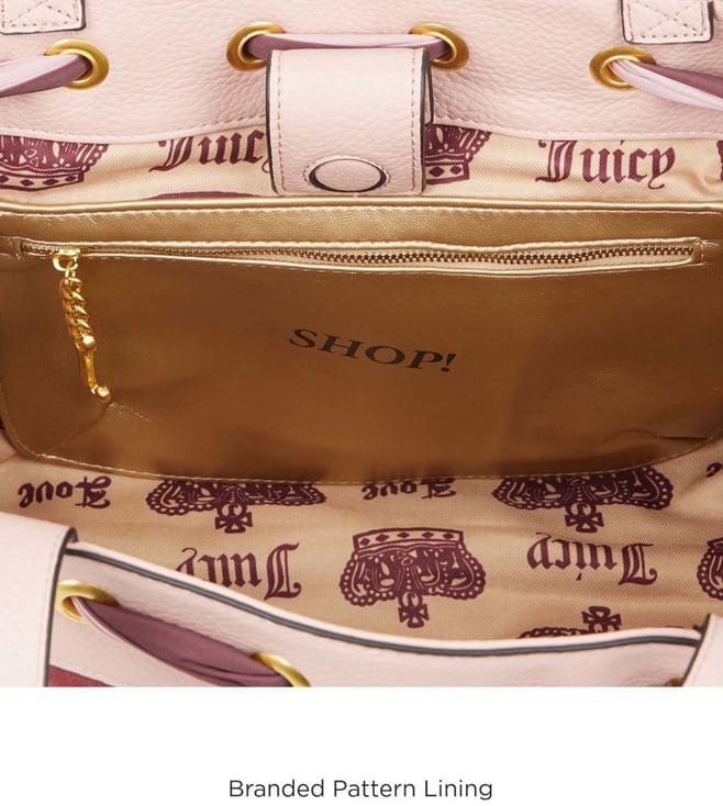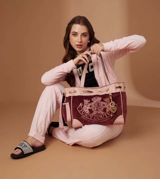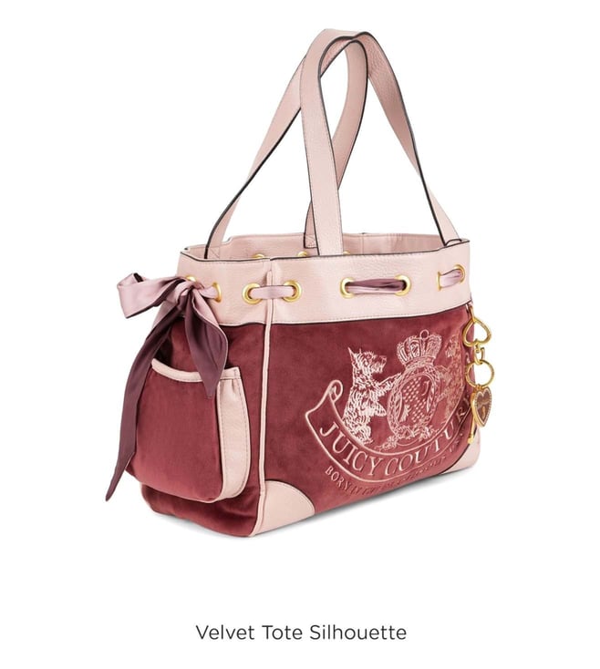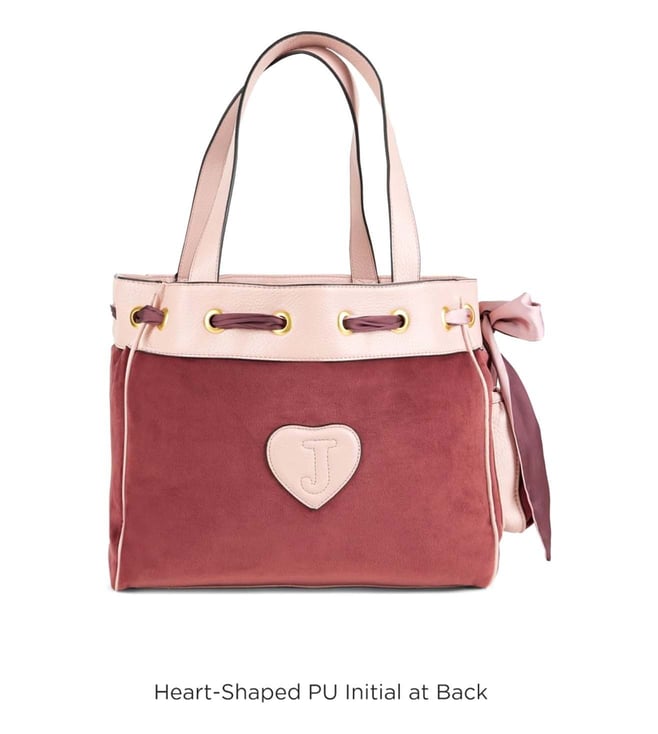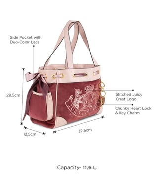 Designed in a plush velvet tote silhouette with dual pu grab handles, this tote blends softness with structure. The stitched juicy crest logo and heart-shaped pu initial at the back add signature charm with a wink of nostalgia. Playful details, elevated a chunky heart lock & key charm, duo-color lace side pocket, and a snap magnetic plus lace-up closure make this bag feel thoughtfully bold - never overdone.