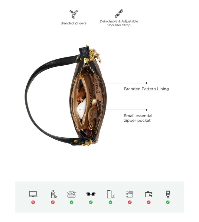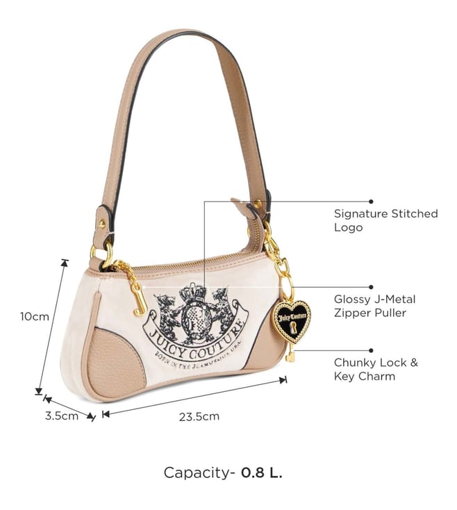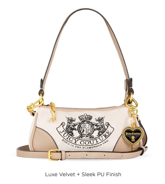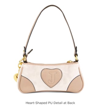 Crafted in a plush velvet and sleek pu fusion, this shoulder bag is stitched with juicy signature logo and flaunts a glossy j-metal zipper puller. It is giving rich-girl energy from every angle. From the heart-shaped pu accent at the back to the chunky lock & key charm, every feature is a total vibe. The adjustable, detachable strap lets you wear it your way - hands-free or handheld fabulous. Inside scoop, juicy style peek inside for a branded pattern lining, a zipper pocket for your essentials, and a heart-shaped mirror for those glam-on-the-go moments.