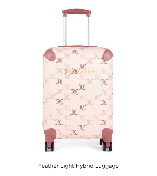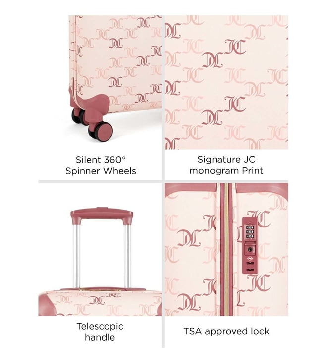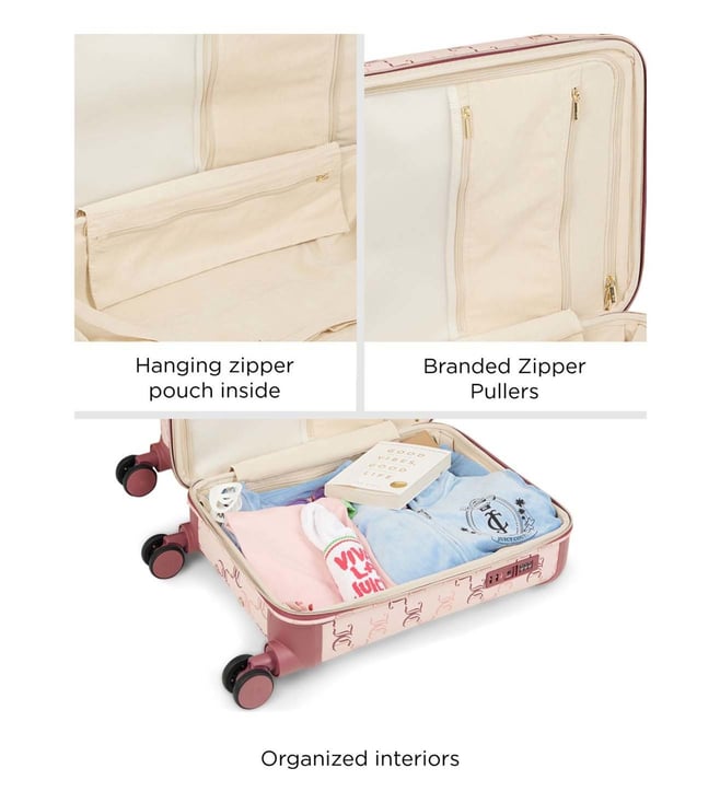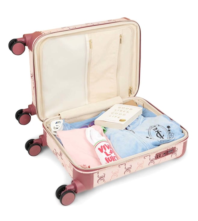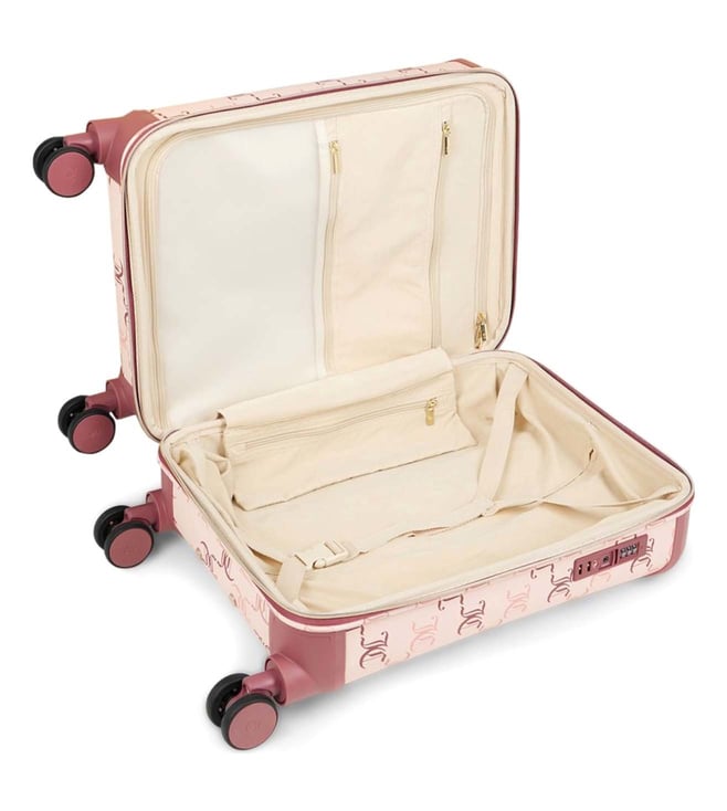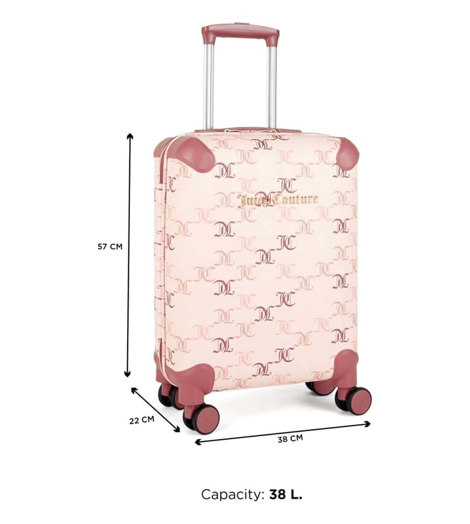 The juicy couture monoglam cabin trolley is the perfect travel companion, blending the brand's iconic style with a host of practical, carry-on-friendly features. This unisex suitcase in powder pink features a unique all-over monogram print on its semi-moulded hardshell, setting it apart from standard luggage. Designed for hassle-free packing, it includes an expander for extra space and a well-organized interior with two compartments and a hanging zippered pouch.