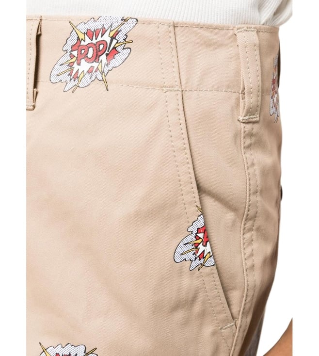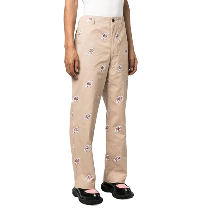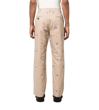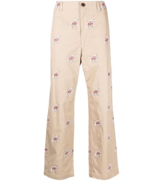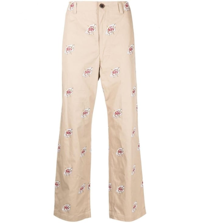 Elevate your style with the Junya Watanabe Beige Printed Regular Fit trousers. Graphicprint cotton trousers from junya watanabe featuring beige, cotton, cartoon print, belt loops, button fly fastening, straight leg, two diagonal pockets to the sides, two rear buttonfastening pockets and straight hem. this piece fits true to size. recommend you get your regular size model is 1,84m / 6ft 1in wearing size m