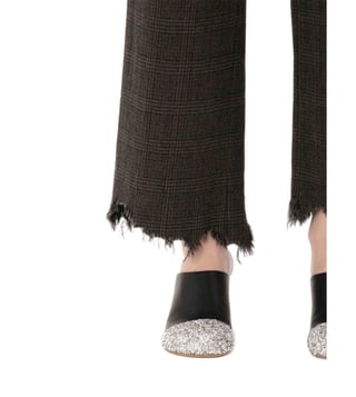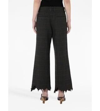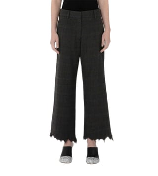 Elevate your wardrobe with the JW Anderson Charcoal Checked Straight Fit Trousers. Designed with dark grey wool trousers featuring a check print, distressed effect, concealed front fastening, two side slit pockets, and two rear welt pockets. composition: 100% wool, country of origin: italy, these trousers combine comfort and sophistication for everyday wear.