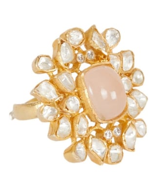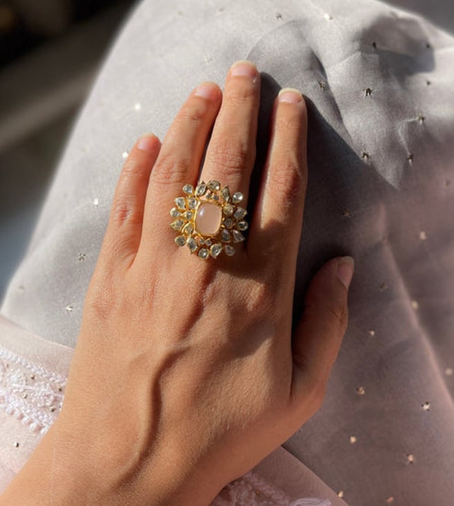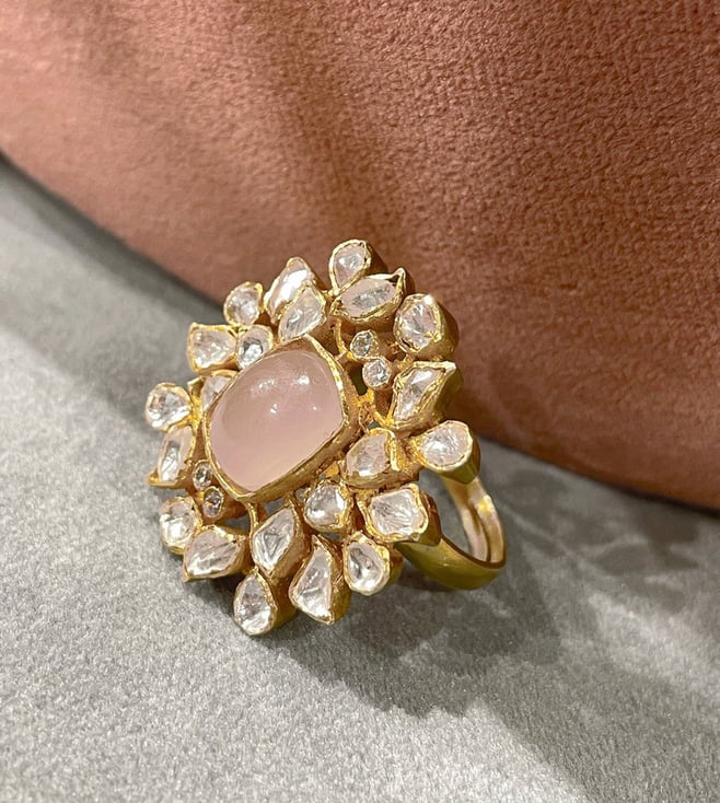 Acquire an enchanting look by donning this 18 kt gold-plated ring. It is crafted from 92.5 silver. It is adorned with vellore polki and rose quart. Disclaimer: Product colour may slightly vary due to photographic lighting sources. Country of Origin - India.