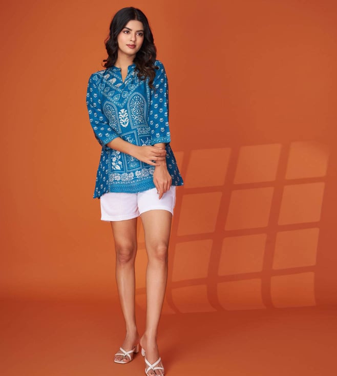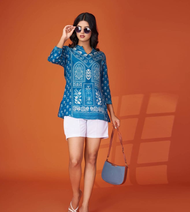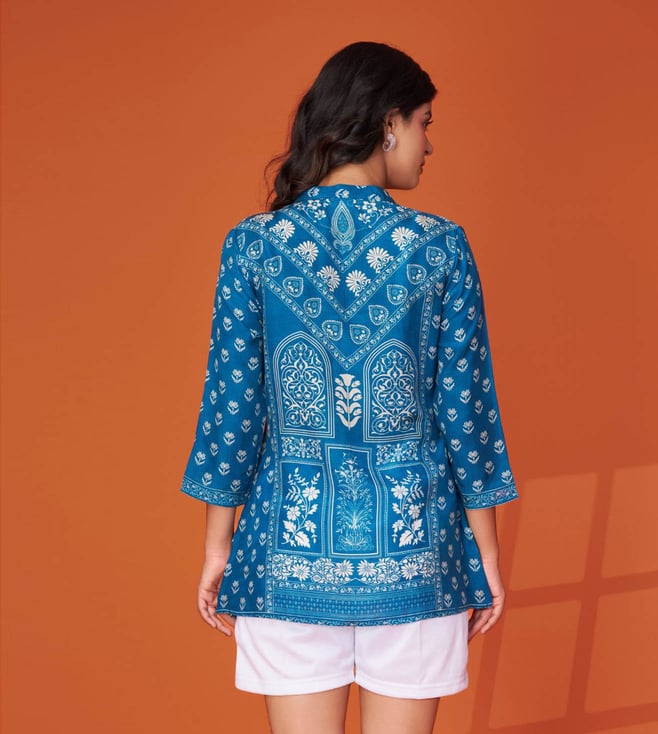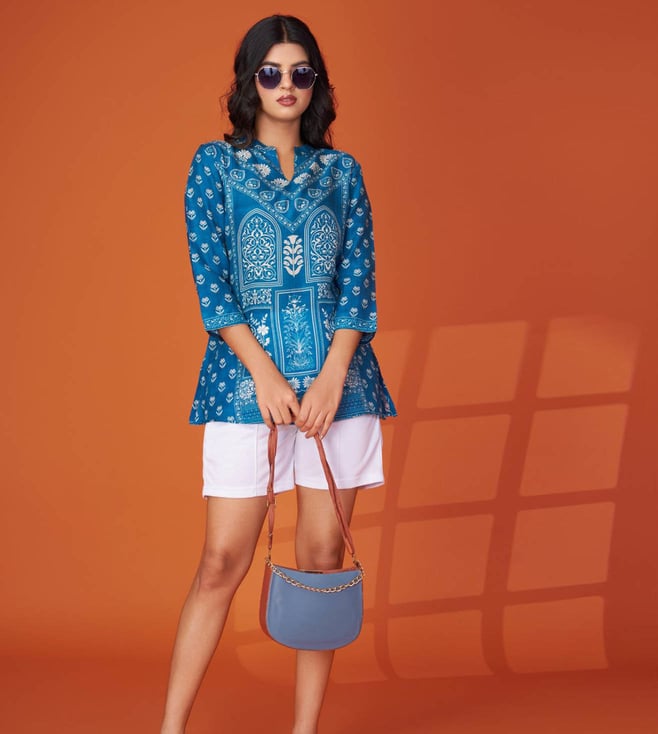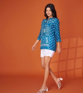 Bring calm and confidence to your wardrobe with this elegant blue short kurti. Perfect for casual outings or office wear, its soothing hue pairs beautifully with denim or white palazzos.