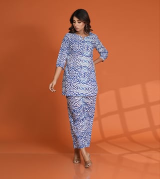 Blue & White Abstract Batik Printed Cotton Cambric Co-Ord Set a kurta set is a traditional outfit typically comprising a long tunic-style paired with matching bottoms. It's known for its comfort, elegance, and versatility, suitable for both casual and festive occasions.