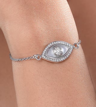 The evil eye diamond with mother of pearl inlay bracelet is featured in the Everyday Luxury collection, which is easy to wear and can take you from day to night. It has been crafted luxuriously using 14KT gold and features a lobster clasp closure that ensures a secure fit on the wrist.