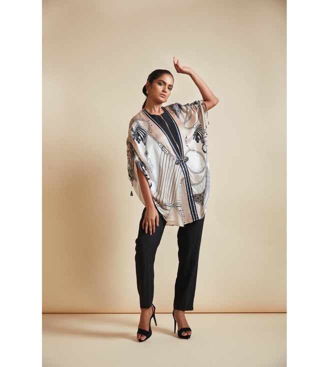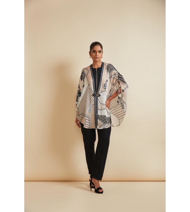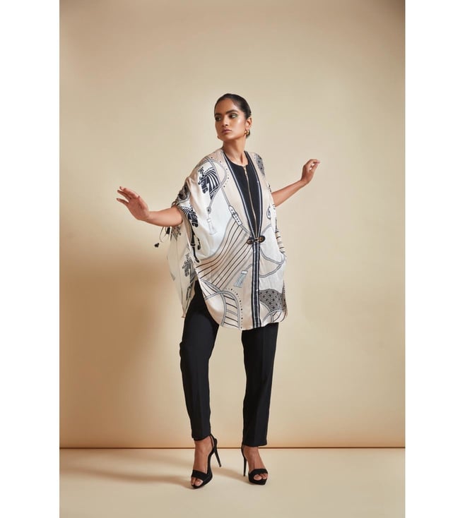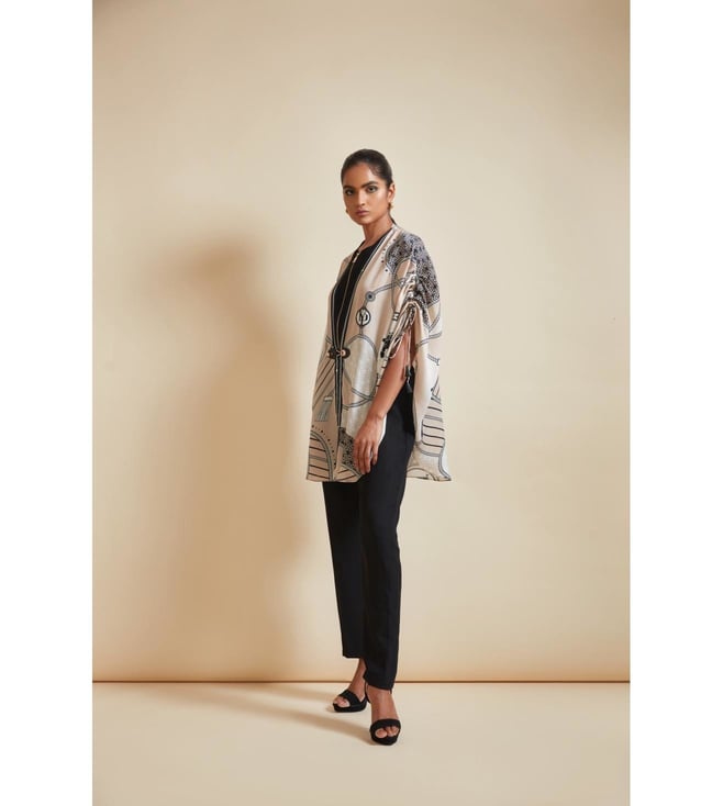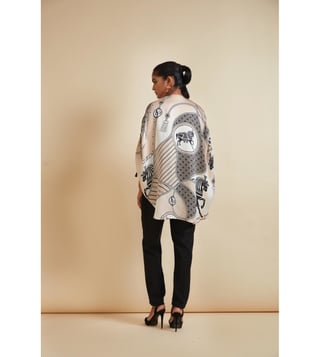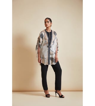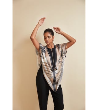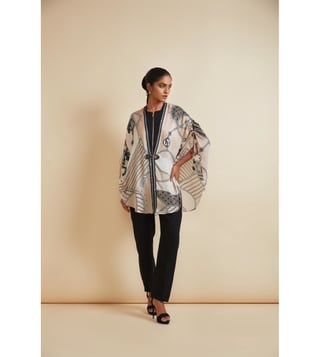 Create a lasting impression on the onlookers by wearing this cape. This zip-detail side open cape comes with a signature farrago print. It features tasselled pull-up tabs and a front clasp in hardware and vegan leather. This garment from the Flow 2.0 collection has been crafted with care using bemberg satin for a soft feel against the skin. Disclaimer: All other items in the image are only for display purposes and will not be a part of the delivery content. Product colour may slightly vary due to photographic lighting sources. Country of Origin - India.
