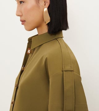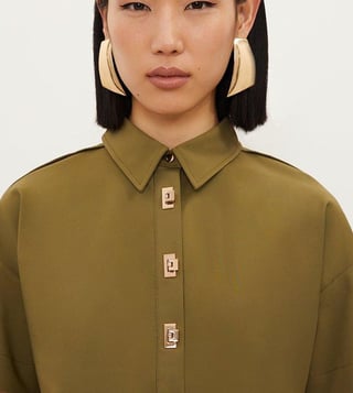 Elevate your everyday style with the Karen Millen Olive Green Hardwear Details Printed Relaxed Fit Shirt. This effortlessly chic shirt combines a relaxed fit with intricate hardwear details, creating a modern and sophisticated look. The olive green colour adds a touch of earthy elegance, while the lightweight fabric ensures comfort all day long. Perfect for both casual and dressy occasions, this shirt is versatile and effortlessly stylish. Upgrade your wardrobe with this must-have piece that will take your outfit to the next level.